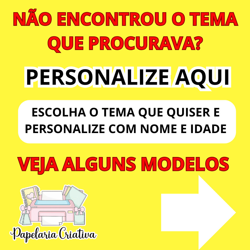 Seja bem vindo(a) a Papelaria Criativa Sobre o produto Topo de bolo Personalizado com seu nome e idade (fazemos qualquer tema) Os Topos de Bolos já vão Colados, PRONTO PARA USO. Todos os apliques já irão recortados e colados em seus palitinhos, utilizamos apenas materiais de primeira linha, palitinhos em acrílico transparente inclusive os palitinhos maiores dando assim mais beleza e higiene na hora de decorar sua festinha Confeccionados em papel fotográfico glossy 180g, dando brilho e beleza caprichando em sua decoração. Possuímos milhares de modelos à sua disposição, confira na opção: ''Ver mais anúncios deste vendedor'' Ou então faça uma pergunta no campo abaixo, teremos o maior prazer em lhe atender!!! OBS: Os doces contidos nas imagens são meramente ilustrativos, serão enviados apenas o topo de bolo personalizado com o nome e idade desejado no tema escolhido. IMPORTANTE: Após a compra enviar os dados abaixo para que possamos agilizar o seu pedido. Tema: CASO QUEIRA OUTRO DE SUA PREFERÊNCIA Nome: Idade: OBS: CASO OS DADOS NÃO SEJAM INFORMADOS NO ATO DA COMPRA O PEDIDO SERÁ ENVIADO COM O DIZER "PARABÉNS" NO LUGAR DA PERSONALIZAÇÃO. Qualquer dúvida, estamos à disposição!!! Agradecemos sua visita!!! BOAS COMPRAS!