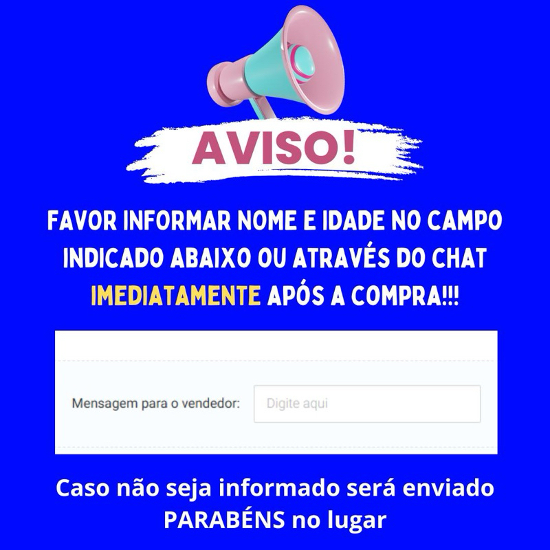 [FAVOR INFORMAR NOME E IDADE NO CAMPO DE MENSAGEM OU CHAT IMEDIATAMENTE APÓS A COMPRA] Caso não seja informado será enviado PARABÉNS no lugar *Topo confeccionado em camadas (3D) *Material utilizado: Papel Fotográfico 180g/ Color Plus 180g/ Offset 180g (a depender do modelo) *Indicado para Bolo de até 2KG - de 15 a 20cm *Enviado já montado e pronto para uso PRAZOS O prazo estimado aparece no anúncio, logo abaixo do frete! Recomendamos fazer o pedido com antecedência para garantir a entrega a tempo do evento. Lembrando que não temos controle quanto a logística, sendo de responsabilidade da plataforma