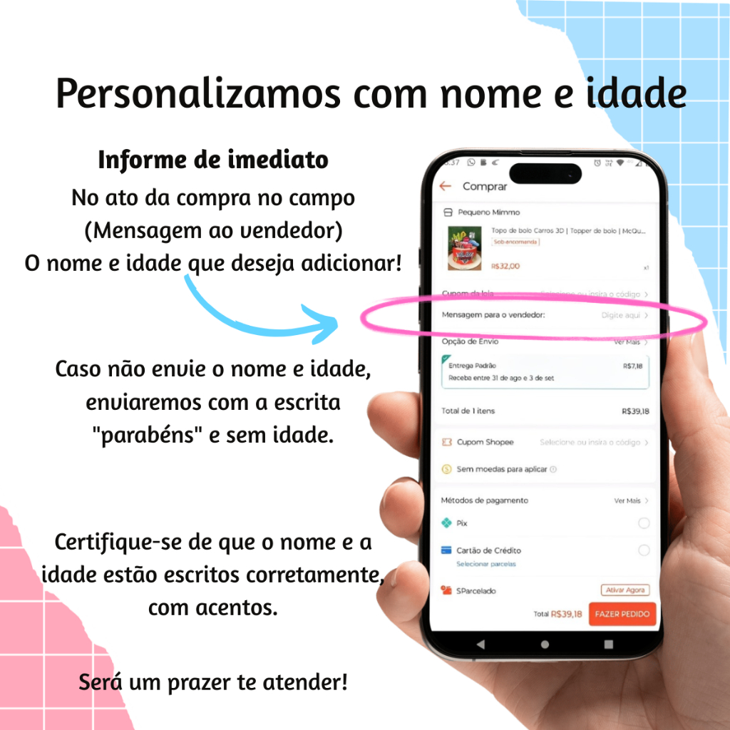 Seja bem vinda(o) Topo de bolo em camadas 3d Vingadores. Personalizamos com nome e idade (informe no chat após a compra). Certifique-se de que o nome e a idade estão escritos corretamente, com acentos. CASO NÃO ENVIE NOME E IDADE O TOPO SERÁ ENVIADO COM A ESCRITA PARABÉNS E SEM IDADE! Acompanha camadas 3D, personagens, palitos (Exatamente como a foto) é só colocar no bolo e arrasar na sua festa! Nossos itens são feitos no papel Fotográfico 230g, Além do papel ser resistente, é impresso em alta qualidade garantindo cores vivas e vibrantes, usamos também papeis coloridos especiais. Tamanho: Para Bolos de 20cm de diâmetro x 10cm altura. Caso queira em outro tamanho, informar previamente no Chat. Verifique com atenção o prazo dado pela plataforma que inclui prazo de produção + o prazo da transportadora. Não finalize a compra caso o prazo final ultrapasse a data da sua festa. Estamos há 6 anos no ramo de personalizados, já produzimos centenas de Topos de bolo e agora também é possível encantar os convidados e elevar o nível da sua festa encomendando conosco aqui pela Shopee. Demais dúvidas é só nos chamar no chat. Será um prazer te atender!