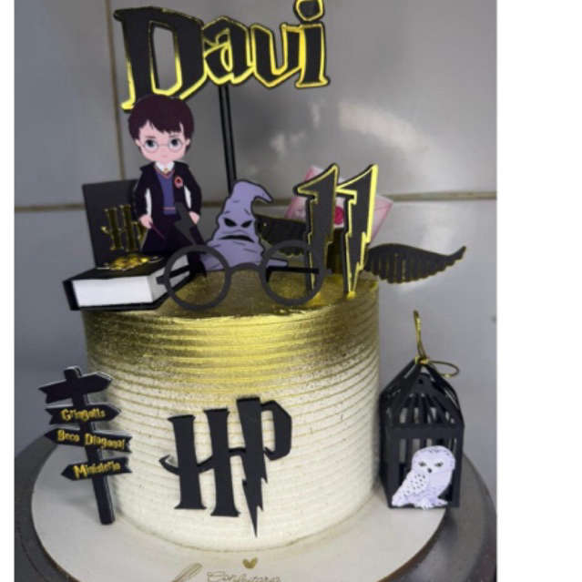Topo/Topper de Bolo Harry Potter, detalhes em dourado.