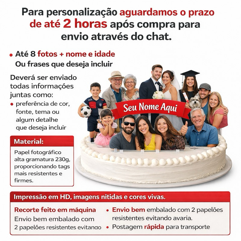 olá seja bem-vindo ! * LEIA DESCRIÇÃO COM ATENCAO* Para personalização aguardamos o prazo de até 2horas após compra para envio através do chat Até 8 fotos + nome e idade Ou frases que deseja incluir Deverá ser enviado todas informações juntas como : preferência de cor , fonte , tema ou alguma detalhe que deseja incluir. Material : Papel fotográfico alta gramatura 230g , proporcionando tags mas resistentes e firmes. Impressão em HD , imagens nítidas e cores vivas. Recorte feito em máquina Envio bem embalado com 2 papelões resistentes evitando avaria. Postagem rápido para transporte