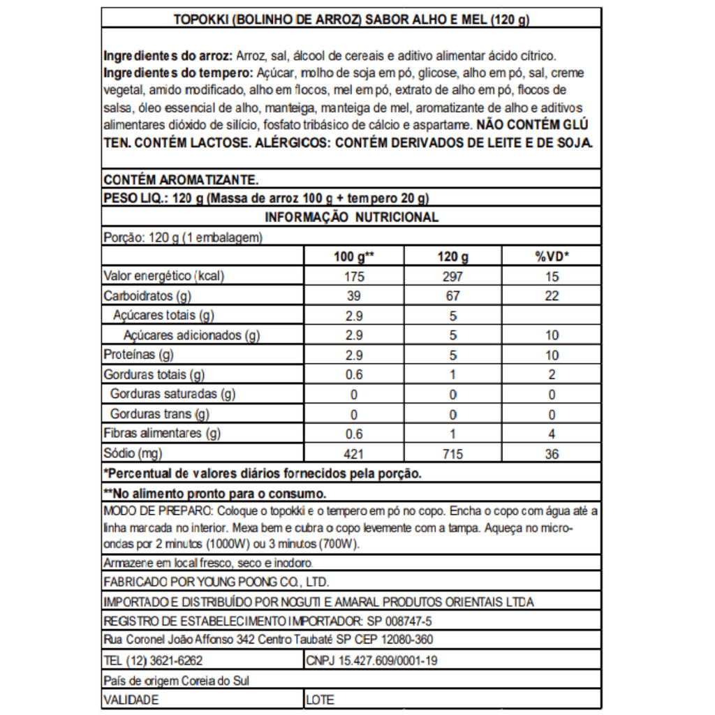Tradicional bolinho de arroz, o topokki (em inglês) é uma típica comida de rua da Coréia do Sul. Consite em um bolinho à base de arroz temperado com a pasta de pimenta mais tradicional da coréia a "gochujang". Nesta versão, além do sabor delicioso do tradicional topokki é adicionado o tempero alho e mel! Experimente essa delícia diretamente da Coréia. MODO DE PREPARO: Coloque o topokki e o tempero em pó no copo. Encha o copo com água até a linha marcada no interior. Mexa bem e cubra o copo levemente com a tampa. Aqueça no micro- ondas por 2 minutos (1000W) ou 3 minutos (700W). Características: Ingredientes do arroz: Arroz, sal, álcool de cereais e aditivo alimentar ácido cítrico. Ingredientes do tempero: Açúcar, molho de soja em pó, glicose, alho em pó, sal, creme vegetal, amido modificado, alho em flocos, mel em pó, extrato de alho em pó, flocos de salsa, óleo essencial de alho, manteiga, manteiga de mel, aromatizante de alho e aditivos alimentares dióxido de silício, fosfato tribásico de cálcio e aspartame. Alérgicos: CONTÉM DERIVADOS DE LEITE E SOJA. Informações adicionais: " Não Contém glúten". " Contém Lactose". Conteúdo: 1 yopokki sabor alho e mel Pink Rocket com 120 gramas. Origem: Coréia do Sul Fabricante: YOUNG POONG CO., LTD.