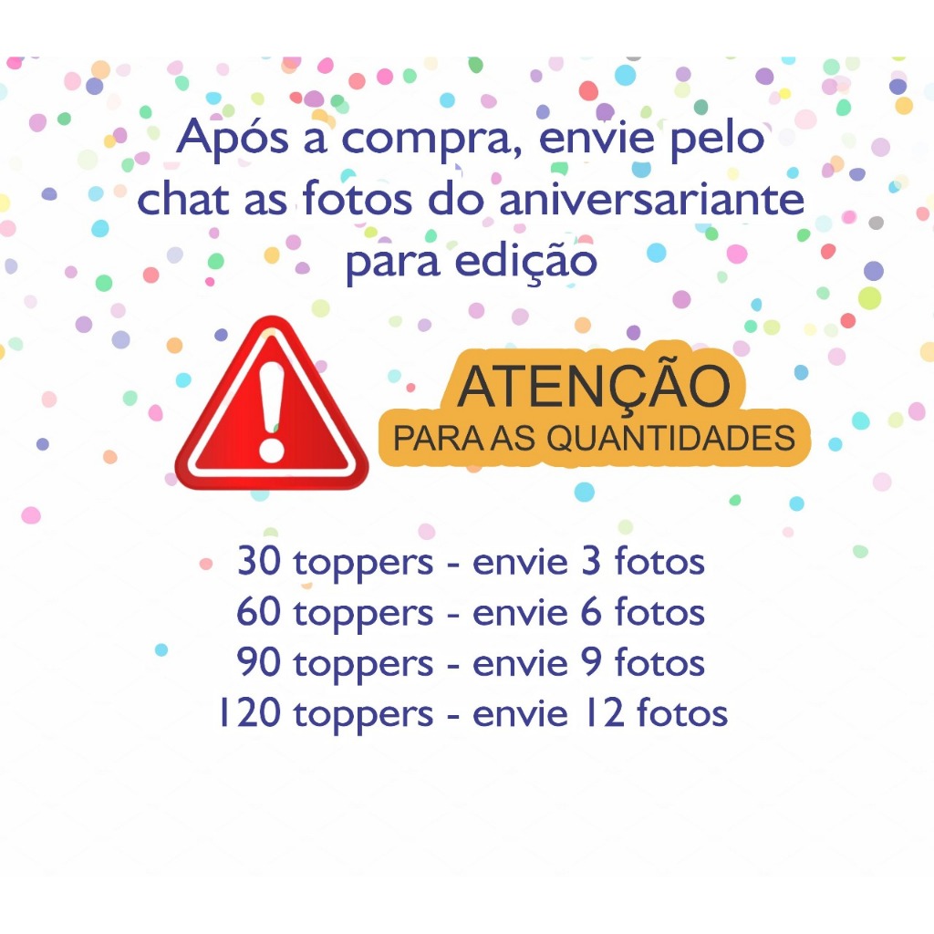 Confeccionado com papel fotográfico 180g Já cortados e colados no palito em acrílico O personagem mede aproximadamente 4 cm O topper inteiro mede aproximadamente 9 cm -Fazemos qualquer tema -Produto artesanal feito a mão. (ATENÇÃO)* AS CORES PODEM SOFRER ALTERAÇÕES DE ACORDO COM O MONITOR UTILIZADO PARA VISUALIZAR OS PRODUTOS COMPRE COM ANTECEDÊNCIA OBS: TEMOS UM PRAZO DE 5 DIAS ÚTEIS PARA A PR0DUÇÃO DO PRODUTO MAIS OS DIAS ESTIPULADOS PELA SHOPPE, PEDIMOS QUE CONFIRA SE ESTÁ DE ACORDO COM O PRAZO ANTES DE REALIZAR A COMPRA. POIS TEMOS ATÉ O ULTIMO DIA DO PRAZO PARA O ENVIO DO PEDIDO. AS FOTOS PARA PERSONALIZAÇÃO COM CHAPÉU NÃO PODERÃO TER: CHAPÉU, BONÉS, TIARAS , ARCOS, CAPUS, GORROS, LAÇOS E OU QUALQUER OUTROS ACESSÓRIOS QUE DIFICULTE A EDIÇÃO DAS FOTOS. CASO OPTE EM ENVIAR FOTOS COM ESSES ACESSÓRIOS NÓS NOS RESERVAMOS DO DIREITO DE NÃO EDITA-LOS. É IMPORTANTE RESSALTAR QUE AS FOTOS ENVIADAS DEVERÁ TER APENAS A FACE DA CRIANÇA/PESSOA, EVITANDO ASSIM O ENVIO DE FOTOS QUE NÃO ESTEJAM NÍTIDAS E DE BOA RESOLUÇÃO. EVITE FOTOS DE PERFIL POIS APÓS A EDIÇÃO NÃO PODERÃO SER TROCADAS. Em caso de dúvidas é só chamar no chat. Teremos prazer em atendê-lo(a).