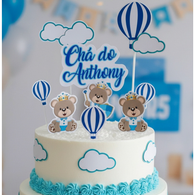 Topper para bolo tema urso balão após a compra enviar nome! *bolo fake não acompanha o topo.