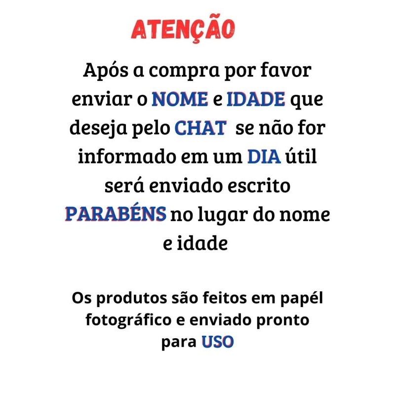 Descrição Do Produto Topo De Bolo CHURRASQUEIRO Personalizado Contem na embalagem 8 peças Com nome e idade personalizados (enviar o nome e idade que deseja pelo chat após a compra). São enviados já cortados e colados em canudos e palitos acrílicos....... Prontos para uso Feito com papel fotográfico de alta qualidade. OBSERVAÇÃO: Enviar o nome e idade que deseja pelo chat após a compra. Se não for enviado o nome e idade até a hora do envio do produto será enviado de forma padrão escrito parabéns no lugar do nome e sem a idade......... * FAZEMOS EM TODOS OS TEMAS * NOS CONSULTE PELO CHAT. OBRIGADA