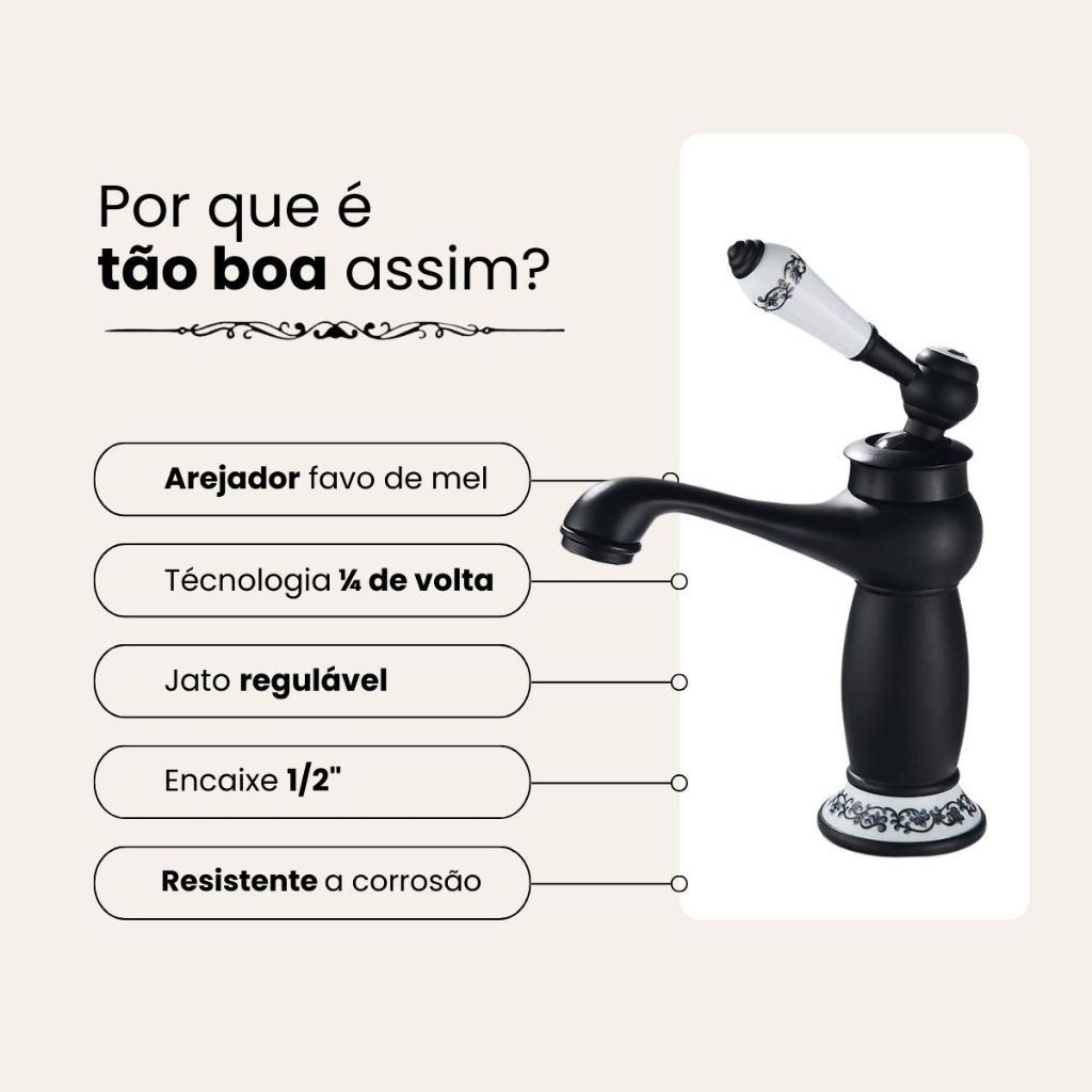 ATORNEIRA MONOCOMANDO PROVENCE PRETA EM LATÃO COM DETALHES EM CERÂMICA 🖤🚿 Design clássico e sofisticado, com controle preciso de vazão e temperatura 💧 Ideal para banheiros elegantes, funcionais e cheios de personalidade ✨ 🌟BENEFÍCIOS: 🕰️ Estilo provençal clássico e atemporal 🎛️ Controle suave e preciso com mecanismo 1/4 de volta 🔥❄️ Misturador para ajuste de água quente e fria 💦 Possibilidade de uso apenas com água fria ✨ Detalhes em cerâmica elegantes e resistentes 💧 Cartucho cerâmico que ajuda a reduzir vazamentos 📐 Altura e inclinação ergonômicas para conforto no uso diário 🛠️DADOS TÉCNICOS: 🔩 Material: Latão 🎨 Detalhes: Cerâmica na manopla e base 🔄 Sistema de abertura: 1/4 de volta 🚿 Função: Misturador quente e frio 💎 Cartucho: Cerâmico 🧱 Instalação: Bancada 📦 Acompanha: Mangueiras e kit de instalação ❄️ Uso apenas água fria: Sim, com conexão em T (não inclusa) ❓PERGUNTAS FREQUENTES❓ Pode ser usada somente com água fria? ❄️ Sim 😊 É possível utilizar apenas água fria com o uso de uma conexão em T, vendida separadamente. O material enferruja? 🚫 Não ✔️ O latão é resistente à corrosão e indicado para ambientes úmidos. A torneira já vem com itens para instalação? 🔧 Sim 👍 Acompanha mangueiras e kit completo para instalação. Ela serve para banheiro? ✨ Sim 💖 É indicada para banheiros e lavabos, especialmente com proposta clássica. ✨ Garanta uma torneira elegante, funcional e durável para seu banheiro e valorize o ambiente com um acabamento clássico, sofisticado e cheio de charme 🖤🚿
