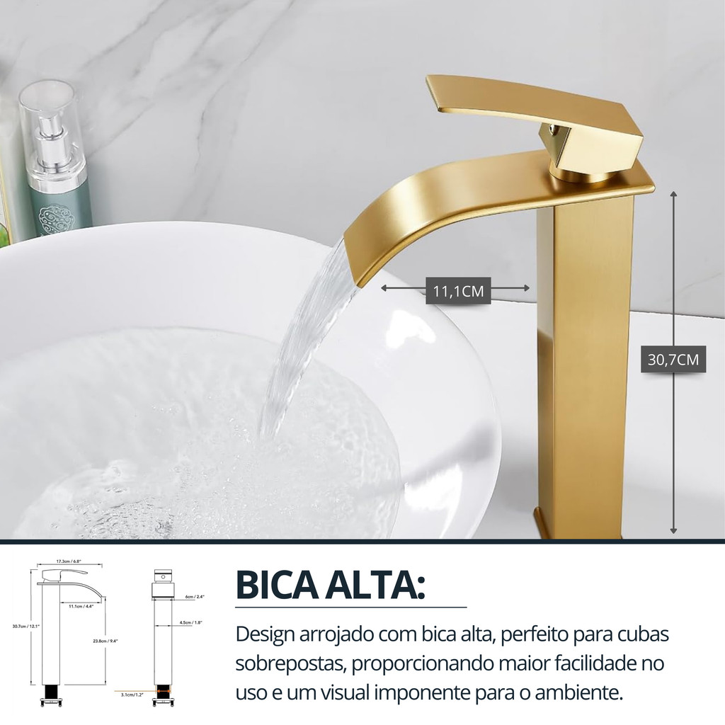 Torneira Cascata Banheiro Bica Alta Monocomando Dourada A Torneira cascata para banheiro com monocomando e bica alta combina funcionalidade e estética. Seu design moderno cria uma cascata suave de água, enquanto o sistema monocomando permite ajustes precisos de temperatura e intensidade. A bica alta proporciona praticidade e um toque contemporâneo à sua pia, elevando a experiência no banheiro. Informações do produto: Material: Metal Cor: Dourado Giratória 360° Permite regular a temperatura da água Tipo de controle: Monocomando Inclui filtro de água: Não É misturador: Sim Inclui aerador: Sim. Medidas do produto (aproximadas): Altura: 27 cm Largura: 6 cm Profundidade: 16,5 cm Altura da base até a saída de água: 26 cm Peso: 0,987 kg Medidas da embalagem (se houver): 20,5cm x 7,5cm x 36cm. Perguntas frequentes: Todos os produtos são novos e possuem garantia de 3 meses. Envio rápido, com postagem em até 24 horas úteis após o pagamento aprovado. Caso tenha mais alguma dúvida ou precise de maiores informações, utilize o campo de perguntas. Estamos à disposição para ajudar.