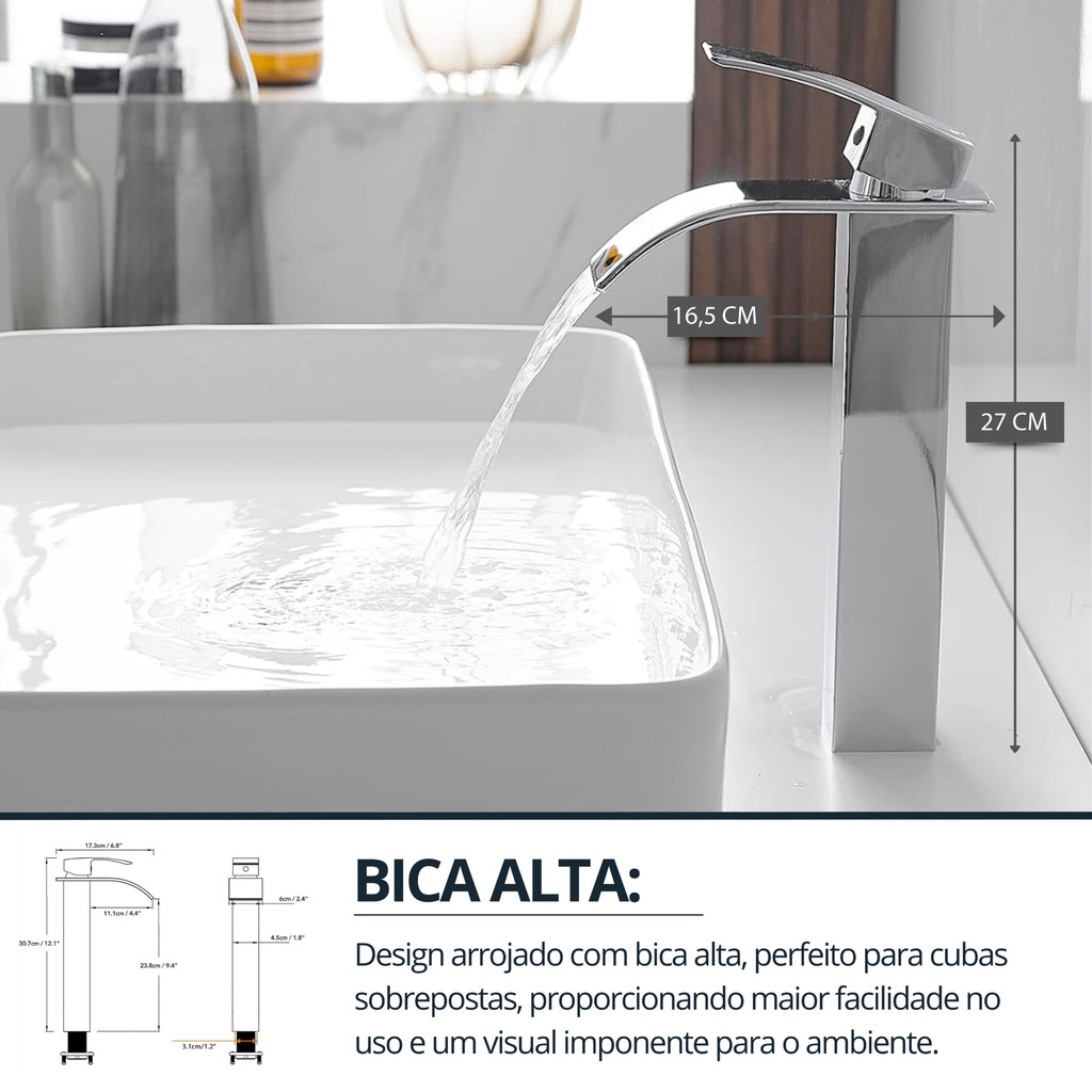 Torneira Cascata Banheiro Bica Alta Monocomando Inox Bancada Acabamento Brilhante Cromado