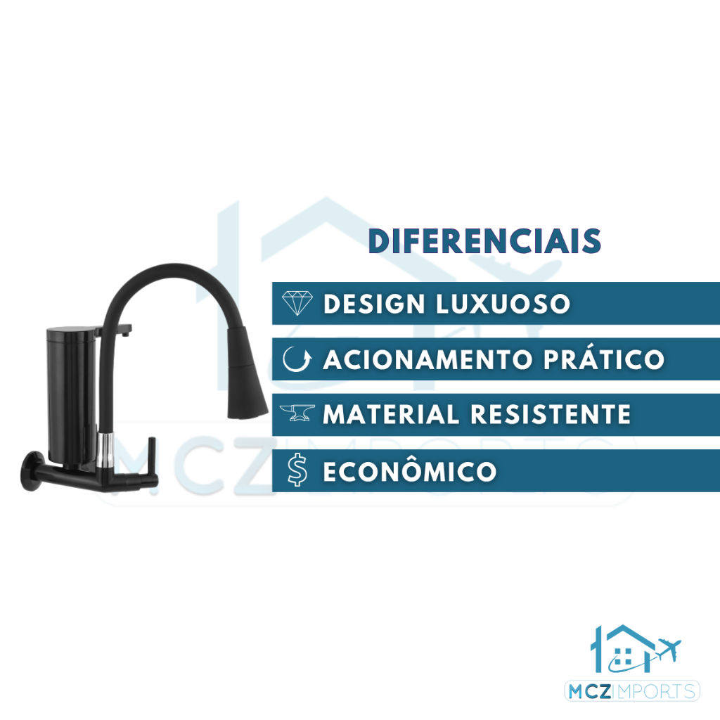 Torneira Com Filtro De Cozinha Pia Gourmet Com Filtro Parede Preta Flex Metal/abs All Black