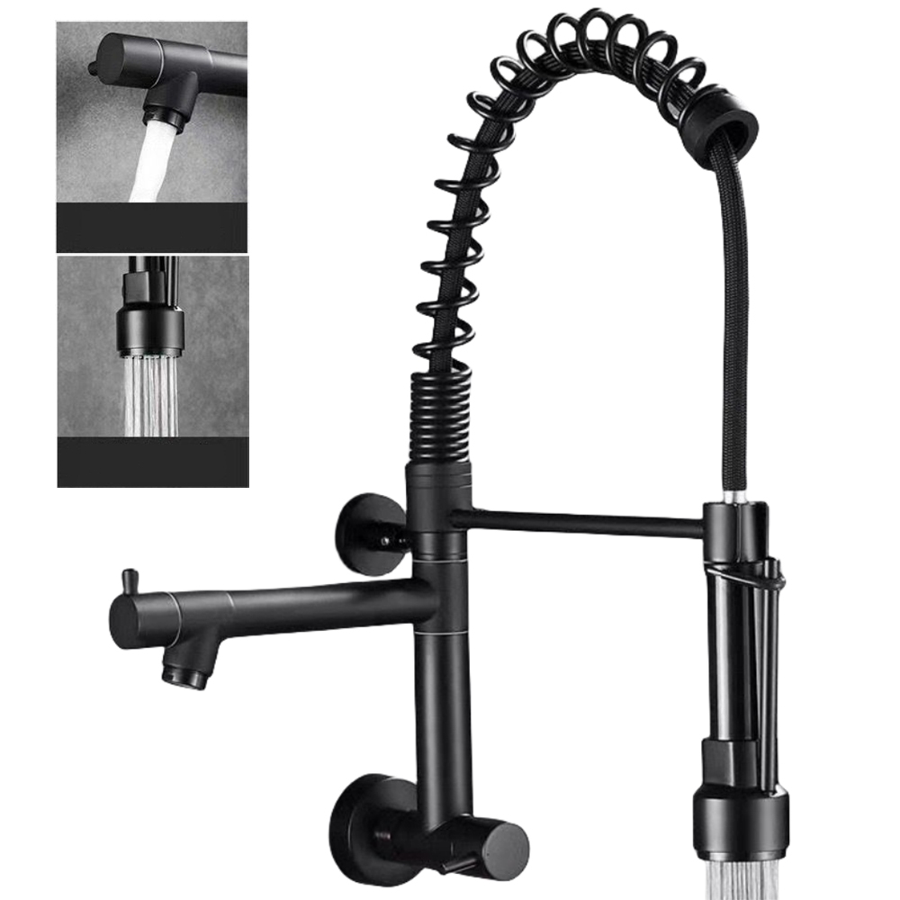 Torneira Cozinha Gourmet De Parede Com Pulverizador Retrátil Com Bica Dupla Cor Preto Fosco Yesop