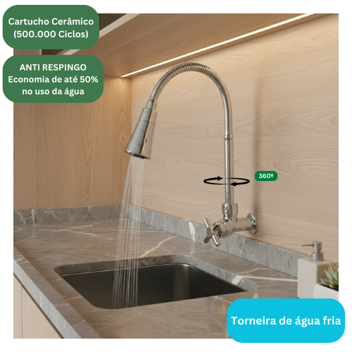 Transforme sua pia em uma estação de trabalho moderna! Esta Torneira Gourmet com Bica Flexível é o item que faltava para unir praticidade e estilo em sua cozinha. Com acabamento Cromado de alto brilho, ela adiciona um toque de sofisticação, enquanto sua bica flexível e arejador proporcionam controle total do jato d'água e facilitam a limpeza de cubas e acessórios grandes. ** Características Técnicas - Tipo de Torneira: De parede. - 2 Modos de saída d’água (Jato e Ducha) - Modelo: Bica Flexível (Gourmet). - Acabamento: Cromado de alto brilho (tripla camada de cromo). - Mecanismo de Abertura: 1/4 de volta (maior agilidade e economia de água). - Material do Corpo: Aço inoxidável + ABS (alta resistência e durabilidade). - Instalação: Apenas para água fria. - Bitola de Entrada: 1/2 polegada. ** Principais Benefícios - Máximo Alcance e Flexibilidade: A bica flexível permite que você direcione o jato para qualquer canto da pia, facilitando a lavagem de louças grandes e o enxágue de frutas e verduras. - Design Moderno e Brilhante: O acabamento cromado de alto padrão confere um visual elegante e sofisticado à sua cozinha, além de ser fácil de limpar. - Mecanismo de Vedação: Cartucho Cerâmico de alta performance (evita vazamentos e proporciona maior vida útil). - Praticidade e Economia: O mecanismo de 1/4 de volta proporciona acionamento rápido da água, evitando desperdício. - Jato D'água Versátil: Possui dois tipos de jato, permitindo que você escolha entre o jato concentrado para maior pressão ou o chuveirinho para um enxágue delicado. - Resistência Garantida: Construída com materiais de alta qualidade para assegurar longa durabilidade e resistência contra corrosão e descascamento. Dimensões: - Altura: 34 cm - Comprimento: 18 cm - Furação (Diâmetro) necessária na bancada: 3,5 cm - Pressão mínima: 4 m.c.a - Pressão máxima: 40 m.c.a