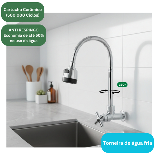 Transforme sua pia em uma estação de trabalho moderna! Esta Torneira Gourmet com Bica Flexível é o item que faltava para unir praticidade e estilo em sua cozinha. Com acabamento Cromado de alto brilho, ela adiciona um toque de sofisticação, enquanto sua bica flexível e arejador proporcionam controle total do jato d'água e facilitam a limpeza de cubas e acessórios grandes. ** Características Técnicas - Tipo de Torneira: De parede. - 2 Modos de saída d’água (Jato e Ducha) - Modelo: Bica Flexível (Gourmet). - Acabamento: Cromado de alto brilho (tripla camada de cromo). - Mecanismo de Abertura: 1/4 de volta (maior agilidade e economia de água). - Material do Corpo: Aço inoxidável + ABS (alta resistência e durabilidade). - Instalação: Apenas para água fria. - Bitola de Entrada: 1/2 polegada. ** Principais Benefícios - Máximo Alcance e Flexibilidade: A bica flexível permite que você direcione o jato para qualquer canto da pia, facilitando a lavagem de louças grandes e o enxágue de frutas e verduras. - Design Moderno e Brilhante: O acabamento cromado de alto padrão confere um visual elegante e sofisticado à sua cozinha, além de ser fácil de limpar. - Mecanismo de Vedação: Cartucho Cerâmico de alta performance (evita vazamentos e proporciona maior vida útil). - Praticidade e Economia: O mecanismo de 1/4 de volta proporciona acionamento rápido da água, evitando desperdício. - Jato D'água Versátil: Possui dois tipos de jato, permitindo que você escolha entre o jato concentrado para maior pressão ou o chuveirinho para um enxágue delicado. - Resistência Garantida: Construída com materiais de alta qualidade para assegurar longa durabilidade e resistência contra corrosão e descascamento. Dimensões: - Altura: 34 cm - Comprimento: 18 cm - Furação (Diâmetro) necessária na bancada: 3,5 cm - Pressão mínima: 4 m.c.a - Pressão máxima: 40 m.c.a
