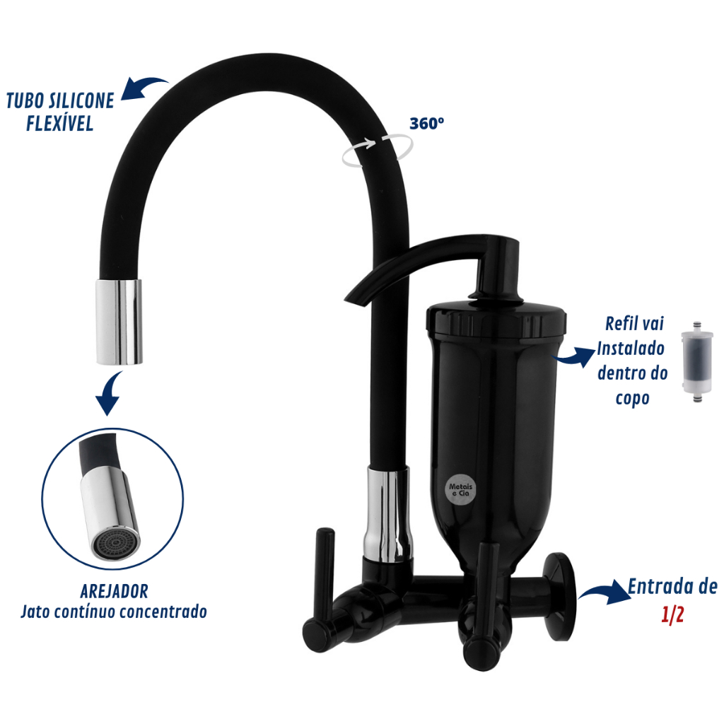 Torneira Cozinha Parede com Filtro e Tubo Silicone Flexível Preto 1/4 de Volta