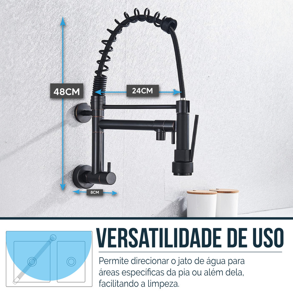 Torneira Cozinha Parede Monocomando Gourmet Preta Com Spray Extensor Flexivel Ajustavel