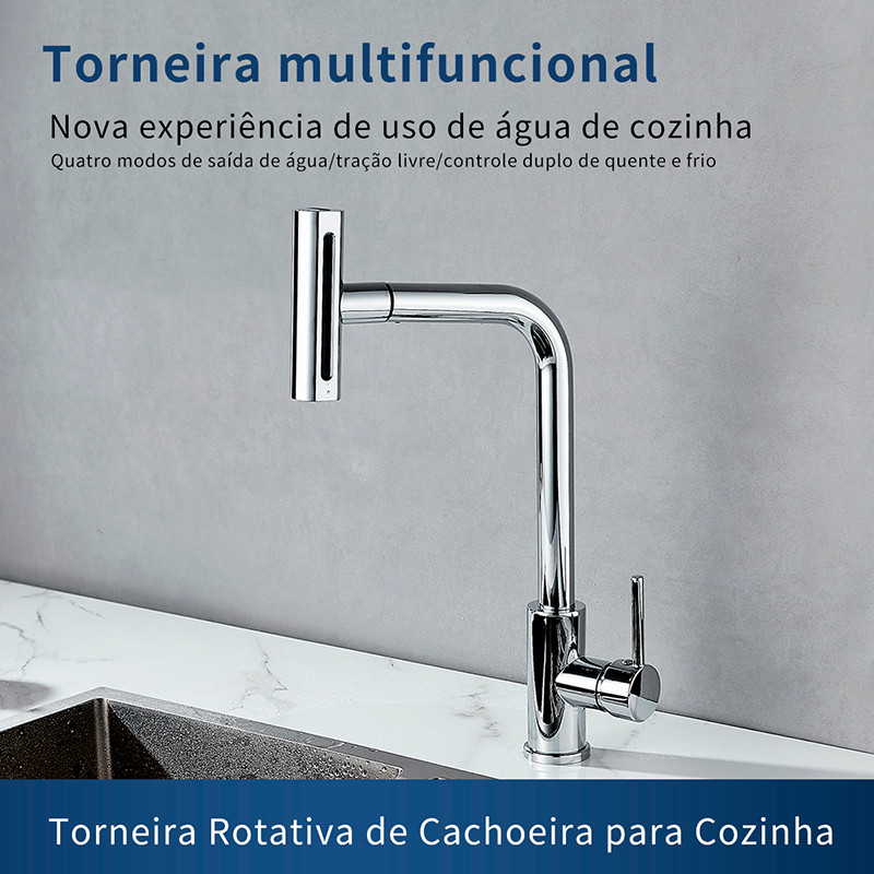Torneira De Cozinha 360 Rotação 4-Funções Bocal De Alta Pressão Aço Inox 304 Cor prata Brilhante