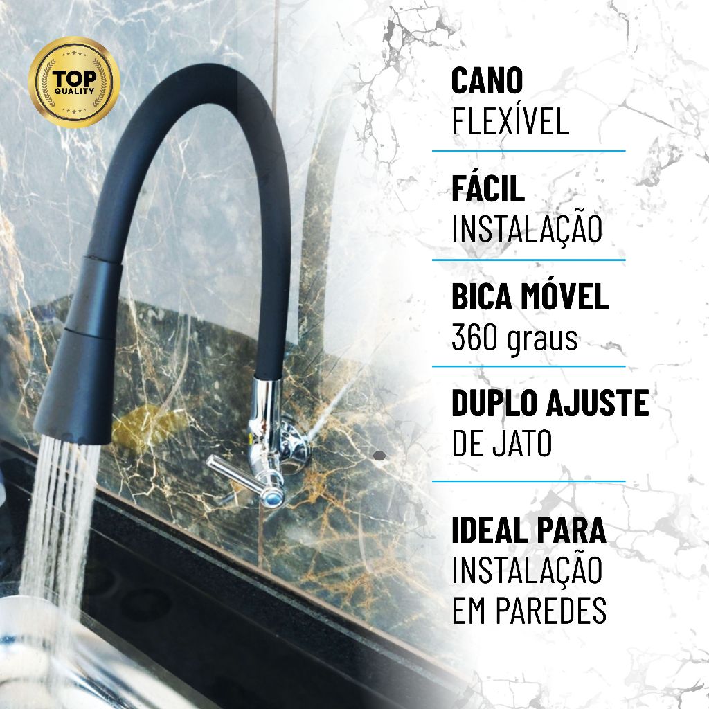 Torneira de Cozinha de Parede Gourmet Preta Flexivel 2 Jatos 1/4 de volta para pia