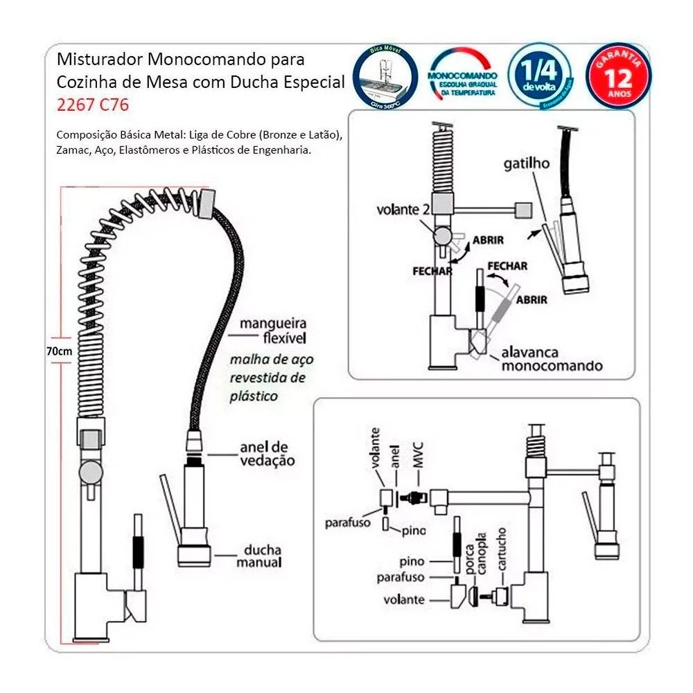 A nova torneira de cozinha monocomando Loren kitchen foi projetada para trazer design para as cozinhas modernas, com a flexibilidade para atender a todos os requisitos de chefs amadores ambiciosos de hoje! Ideal para cozinhas que tem armários acima da pia e 2 cubas. Vem com bica móvel e arejador articulado e sua ducha especial tem longo alcance. A temperatura da água é facilmente controlada pelo volante lateral com o mecanismo monocomando. Indicada para o uso de água quente e com polegadas para rosca de 1,2 é ideal para usar na sua cozinha. Não perca a chance de dar o melhor acabamento para sua casa com a qualidade Lorenzetti. Vantagens: - Ducha flexível de longo alcance, ideal para cubas duplas - Jato spray de alta performance - Bica Móvel 360°: maior mobilidade, praticidade no uso - Mecanismo de Vedação Cerâmica: maior vida útil, praticidade e conforto, 1/4 de volta: rapidez no acionamento e fechamento, que proporciona economia de água. - Arejador Embutido: design clean e elegante, jato uniforme e sem respingos, que proporciona economia de água. - Mecanismo Monocomando: cartucho de alta durabilidade da vazão, escolha gradual de temperatura. Características Técnicas: - Modelo: 2267 C76 - Cor: Cromado - Local indicado: Mesa - Cômodo indicado: Cozinha - Entrada: ½? - Comando: ¼ de volta - Possui arejador: Sim - Bica: Móvel 360º - Pressão de funcionamento: 70 KPA / 7 MCA E NO MÁXIMO 400 KPA / 40 MCA (METRO DE COLUNA DE ÁGUA)