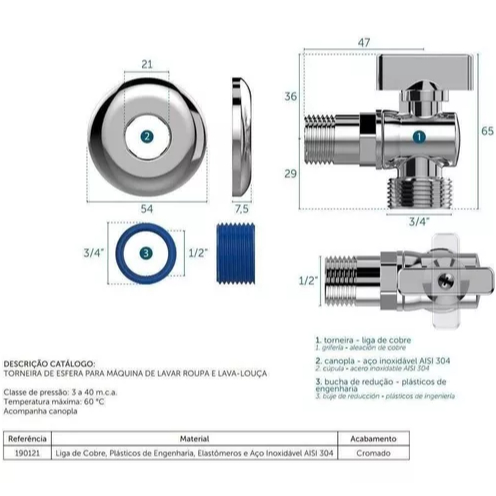 Torneira De Esfera P/ Maquina De Lavar Roupa/Louça Toda em Metal Cromado1/2 X 3/4