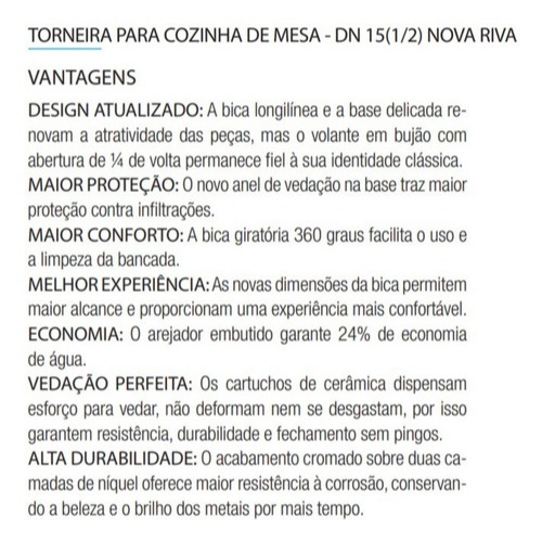 Ficou alguma dúvida? Faça sua pergunta, ficaremos satisfeitos em lhe atender bem. Emitimos Nota Fiscal. Qualidade, preço Justo e atendimento Perfeito. A Linha Riva, um clássico do portfólio Docol, acaba de receber atualizações que tornam suas peças ainda mais atrativas e práticas. O novo desenho é mais moderno e longilíneo, possibilita uma melhor experiência no uso cotidiano dos produtos e uniformiza componentes entre linhas, assim consumidores e clientes passam a poder optar por diferentes acionamentos para um conjunto de corpo e bica padronizados: bujão para a Linha Riva, trizeta para a Linha Trio e alavanca para a Linha Gali. O foco no conforto permanece, e agora as torneiras e misturadores da linha contam com dimensões mais adequadas aos novos conceitos de moradia. Além disso, detalhes aprimorados fazem toda a diferença no design e no ambiente. Características: - Acabamento: Polido, - Sistema de abertura: 1/4 Volta, - Arejador: Arejador Articulado, - Bitola: 1/2" - DN 15, - Classe de pressão: 2 a 40 m.c.a, - Temperatura máxima da água: 70°C, - Composição: Ligas de cobre, elastômeros, plástico de engenharia e zamac (ligas de zinco, alumínio, magnésio e cobre), - Mobilidade da bica: Giratória 360°, - Acionamento: Redondo, - Tipo de instalação: Mesa. Conteúdo da embalagem: - 1 volante, - 1 corpo, - 1 cartucho, - 1 parafuso, - 1 tubo curvo, - 1 articulador, - 1 arejador, - 1 porca, - 3 aneis o-ring, - 1 anel de retenção, - 1 anel retangular, - 1 contra porca, - 1 canopla. Ficou alguma dúvida? Faça sua pergunta, ficaremos satisfeitos em lhe atender bem. Emitimos Nota Fiscal. Qualidade, preço Justo e atendimento Perfeito.