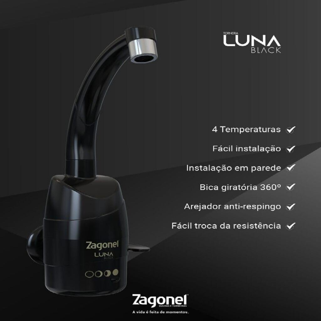 A Torneira Luna recebe este nome inspirada na Lua e sua influência sobre o movimento das marés. Apresenta em seu design, linhas orgânicas que remetem ao movimento e a fluidez das águas, além de ter em seu seletor de temperatura a representação das fases da lua. Tecnologia, eficiência, conforto e design são os quatros pilares fundamentais presentes na torneira Luna. Além de elegância e estilo, ela traz conforto e praticidade com excelente vazão de água e ajuste de temperatura para todas as estações do ano. Tecnologia A torneira elétrica multitemperatura 4T Luna Parede Black Zagonel utiliza tecnologia avançada para garantir eficiência e praticidade, permitindo o ajuste de temperatura em 4 níveis diferentes. Além disso, possui sistema de proteção contra choque e proteção diferencial residual (DR), tornando o uso seguro para o usuário. É compatível com sistemas de aquecimento solar e a gás, garantindo maior versatilidade e economia. Praticidade A torneira elétrica Zagonel Luna oferece praticidade no uso diário, com sua bica giratória 360° e seleção de temperatura em quatro opções. Além disso, possui arejador anti-respingo e registro com 1/4 de volta para um controle fácil e preciso do fluxo de água. Notas Técnicas Pressão e armazenamento: Pressão mínima de acionamento: 15 kPa (1,5 m.c.a.) Armazenamento de água na câmara de aquecimento: 400ml Segurança: Sistema de Proteção Contra Choque: sim Sistema de Proteção Diferencial Residual (DR): sim Grau de proteção: IP24 Compatibilidade: Compatível com sistemas de aquecimento solar e a gás: sim Outros: 4 temperaturas disponíveis Bica giratória 360° Arejador anti-respingo Registro com 1/4 de volta Resistividade mínima de água: 1.300 Ω x cm Potência: 5500W Garantia: - 12 meses de garantia - Resistência com 3 meses garantia