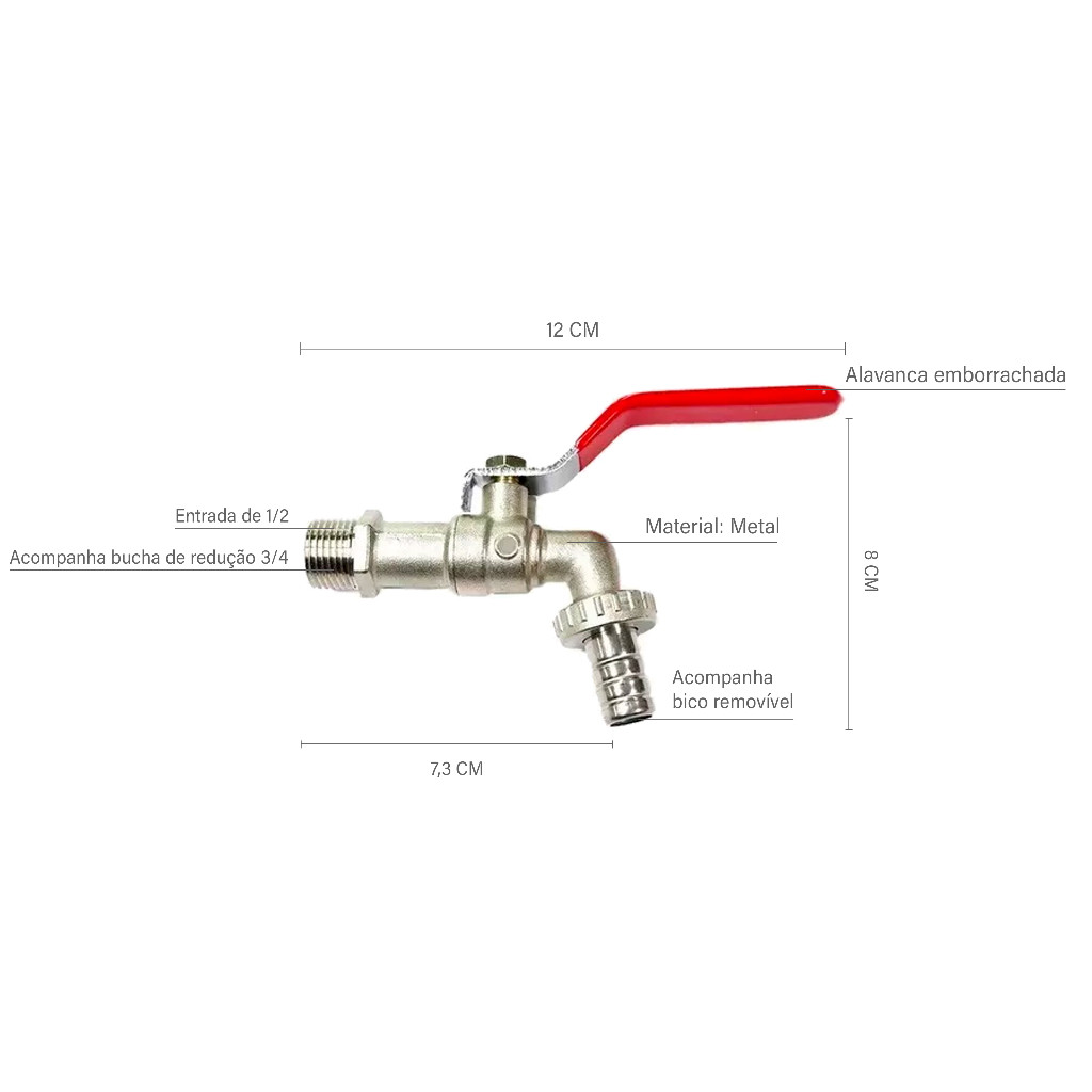 ------------------------------------------------------------------------------------------------------------------- ENVIO RÁPIDO E PRODUTOS A PRONTA ENTREGA!!! ------------------------------------------------------------------------------------------------------------------- Torneira esfera de jardim com bico para encaixe de mangueira, ideal para área externa como jardins, garagem ou tanque. Possibilita o uso de mangueira, facilitando a limpeza em locais longe da saída de água. Aproveite a compre já a sua. Torneira esfera metálica com cabo emborrachado para sua casa A esfera dentro do equipamento tem um orifício no meio que quando alinhado com as extremidades da válvula permite a passagem de fluxo, quando a válvula é fechada, o orifício fica perpendicular as extremidades da válvula e o fluído é, então, interrompido. A Válvula esfera é uma das válvulas mais utilizadas em residências e indústrias. Características : -Produto : Torneira Com Bico -Material : Metal Fundido, Ferro, zinco -Material Da haste : Metal Com Borracha -Rosca de entrada de água: 1/2 (acompanha bucha 3/4) -Cabo: Emborrachado -Local de uso: Jardim/Área de Serviço - Lugar : Parede