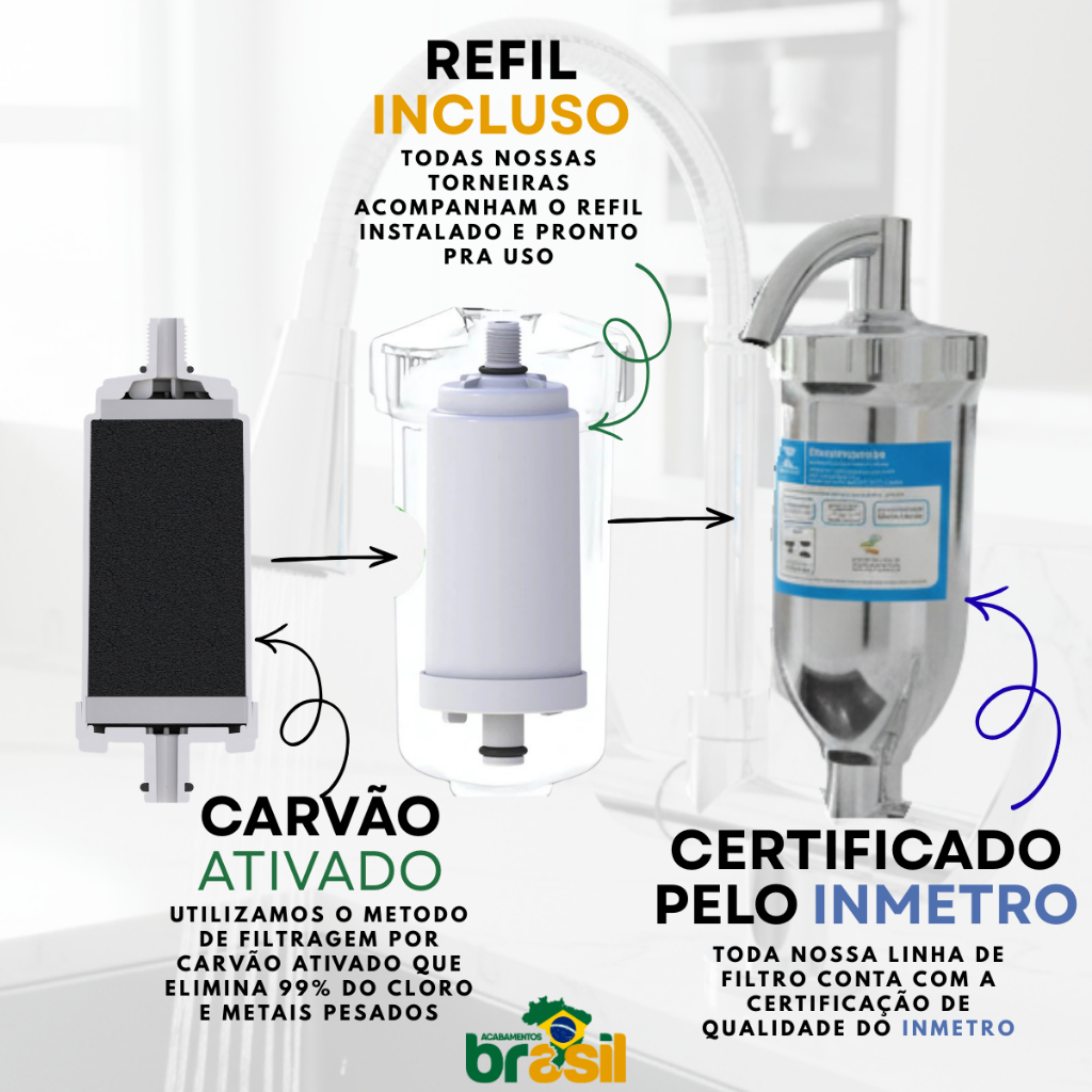 🌟 Torneira Filtro Gourmet 2168 Monoc - ABS de Engenharia | Carvão Ativado Incluso | Design Luxuoso Transforme sua cozinha com a Torneira Filtro Gourmet 2168 Monoc, da linha Luxo da Acabamentos Brasil! Fabricada em ABS de Engenharia, combina alta resistência e um design moderno, com o filtro de carvão ativado incluso para água mais pura e saborosa. ✔ Por que esta torneira é ideal para você? Filtro de carvão ativado incluso: Remove cloro livre, partículas (>15µm) e melhora o sabor da água. Bica alta flexível e arejador duplo: Controle preciso do jato (chuveirinho ou fluxo concentrado) e economia de água. Mecanismo 1/4 de volta: Vedação cerâmica para abertura suave e sem desperdício. Acabamento cromado monoc: Resistente à oxidação e fácil de limpar. ✔ Especificações Técnicas: Material: ABS de Engenharia (antimpacto e durável). Filtro: Vela de carvão ativado já inclusa (vida útil: até 6 meses). Pressão máxima: 40 mca. Dimensões: 26cm (altura) x 24cm (largura) x 14cm (profundidade). ✔ Certificação e Segurança: Certificação OCP TS4 0134: Garante eficiência na redução de cloro e retenção de partículas. Sem eficiência bacteriológica: Recomendado para água já tratada. ✔ Garantia: 12 anos para uso residencial (com nota fiscal). 2 anos para uso coletivo. ✔ Instalação e Manutenção: Compatível com pias/bancadas. Limpeza: Use pano úmido e sabão neutro para preservar o acabamento. torneira filtro cozinha luxo torneira com carvão ativado torneira bica alta flexível torneira 1/4 de volta economizadora