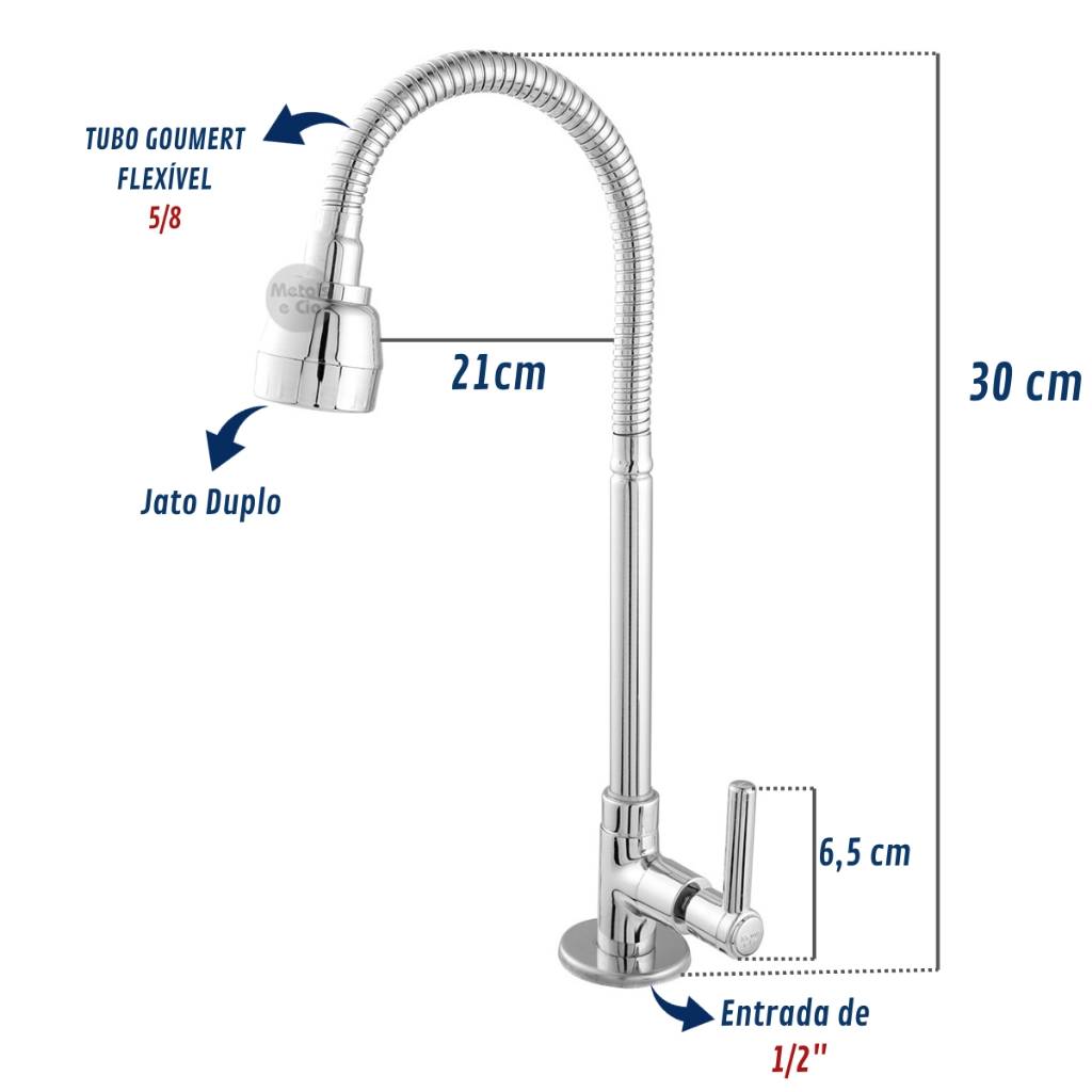 Torneira Cozinha Bancada Sem Filtro Tubo Gourmet. ATENÇÃO!!! Este anúncio possui dois modelos de torneira, BANCADA GOURMET e BANCADA BICA MÓVEL, certifique-se de adicionar ao carrinho de compras o modelo desejado. ESPECIFICACÕES: -Marca: Metais e Cia. -Material: ABS. -Pressão Mínima: 4 MCA - metros de coluna d'agua para um bom funcionamento. -Entrada de agua: 1/2 polegada. -Mecanismo de acionamento: metal cerâmico 1/4 volta. -Tubo: Gourmet Móvel ate 360 Graus. -Dimensões: Altura posição normal: aproximadamente 30 cm. -Itens Inclusos: 1 Torneira Gourmet. 1 Canopla, Arruela e Porca.