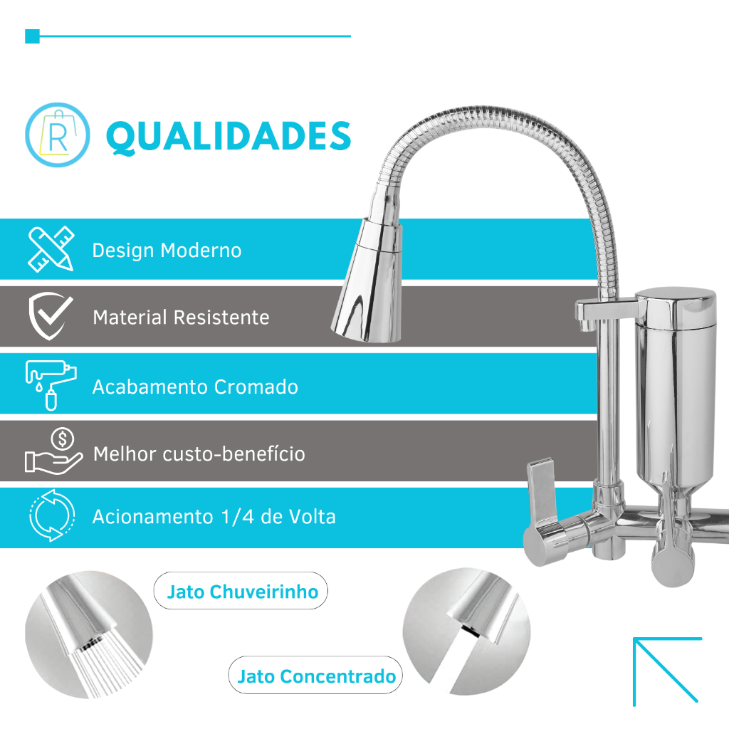 Torneira Gourmet Cozinha Com Filtro Parede Pia Dois Jatos Flexível 1/4 de Volta - 1053