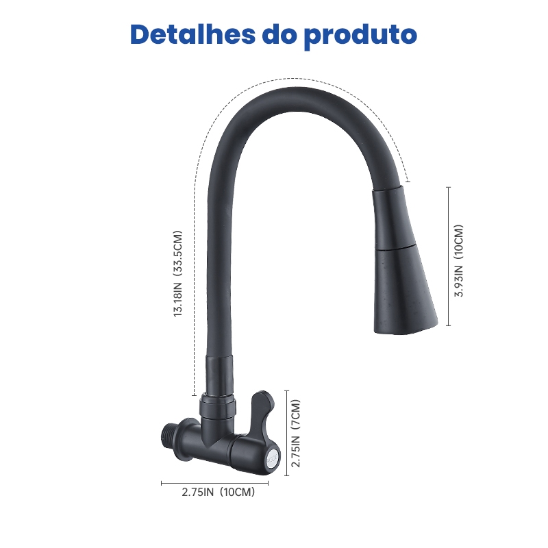 Torneira Gourmet Preta de Parede Flexível com Cone Duplo de Pulverização 1/4 KOGLD