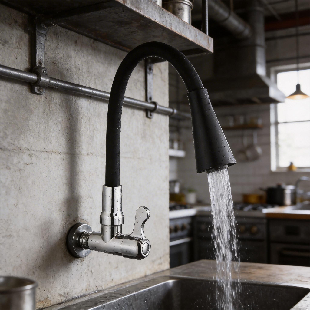 Torneira Industrial de Parede Preto e Prata, Tubo Flexível Preto, Design Moderno para Cozinha e Varanda
