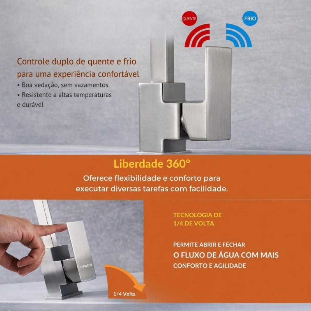 Transforme sua cozinha com a Torneira Gourmet Monocomando Lopazzi, um item que é tendência em arquitetura de interiores. Com um design sofisticado e corpo totalmente em aço inoxidável escovado, este produto é perfeito para cozinhas, ilhas e áreas gourmet, criando uma atmosfera moderna e elegante. O toque final que seu projeto precisa para se destacar. Este misturador oferece controle térmico impecável com seu sistema monocomando, permitindo que você regule a temperatura e a vazão da água com um só toque da alavanca. O cartucho cerâmico de alta resistência proporciona facilidade e controle total durante o manuseio. Além disso, pode ser aplicado em cubas duplas ou grandes, adaptando-se ao seu espaço e estilo graças à sua bica com rotação completa de 360 graus. ESPECIFICAÇÕES TÉCNICAS Altura: 37 cm Largura: 5 cm (Base) Profundidade: 22 cm Material: Aço Inoxidável 304 Cartucho: Cerâmico de alta durabilidade (500.000 ciclos) Pressão recomendada: 5 a 40 mca Peso: 1,8 kg (Aproximado) FUNÇÕES E CARACTERÍSTICAS Misturador monocomando para água quente e fria Bica móvel com rotação de 360 graus Arejador integrado para maior economia de água Design moderno e sofisticado COMPATIBILIDADE Ambientes recomendados: Cozinhas, Áreas Gourmet, Churrasqueiras e Varandas Gourmet. Adapta-se a diferentes estilos como: Moderno, Industrial, Minimalista e Contemporâneo. ITENS INCLUSOS 1 Torneira Monocomando Inox Escovado 2 Mangueiras flexíveis para instalação (água quente e fria) Kit de fixação (porcas e borrachas de vedação) GARANTIA 3 meses contra defeitos de fabricação. A garantia cobre defeitos de fabricação e não inclui danos causados por manuseio inadequado. torneira gourmet, torneira cozinha, torneira monocomando, misturador cozinha, torneira inox, torneira escovada, torneira yesop, torneira bica alta, torneira pia cozinha, torneira bancada, torneira agua quente fria, torneira articulavel, torneira 360 graus, torneira luxo cozinha, misturador monocomando, torneira aço inox 304, torneira gourmet escovada, torneira area gourmet, torneira misturador, reforma cozinha