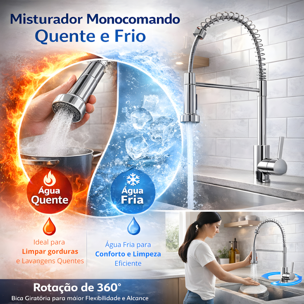 Sem dúvida, a cozinha é um dos locais mais movimentados da casa e, portanto, é muito importante escolher a torneira que se adapte às necessidades de uso. A marca oferece um design confortável e prático que permitirá regular a saída de água ao lavar pratos, cozinhar, etc. Design vanguardista pensado para você O controle monocomando é um sistema moderno, durável e fácil de instalar. Permitirá que você opere a abertura e o fechamento do fluxo com apenas uma mão. Possui duas entradas de água, permitindo o uso de água fria e quente. Flexível e giratória A sua rotação de 360º permite ajustar a direção e o ângulo da torneira. É ideal para máquinas de lavar louças grandes ou duplas. Economize água, evite salpicos O arejador torna a saída de água espumosa, lisa e com menos pressão. Isso minimiza salpicos e permite uma economia de água de até 30%. Não é legal? Minimalismo na sua cozinha O metal é um material cheio de vantagens: higiênico, resistente e anticorrosivo. Além disso, é elegante e oferece um estilo moderno e minimalista. Estenda suas possibilidades Com bico extensível, esta torneira lhe dará mais praticidade para chegar a onde você precise. Evite respingos e mantenha seu espaço sempre limpo. Bico flexível para agilizar as tarefas Seu bico flexível lhe permite realizar várias ações em simultâneo. Lave a louça enquanto desinfeta os vegetais e economize tempo para aquilo que é importante! Consumo inteligente Esta torneira incorpora um selo de cerâmica, que ajuda a reduzir o consumo de água e requer manutenção mínima. Cuide de sua economia e colabore com o cuidado do meio ambiente. ENVIAMOS EM ATÉ 24H