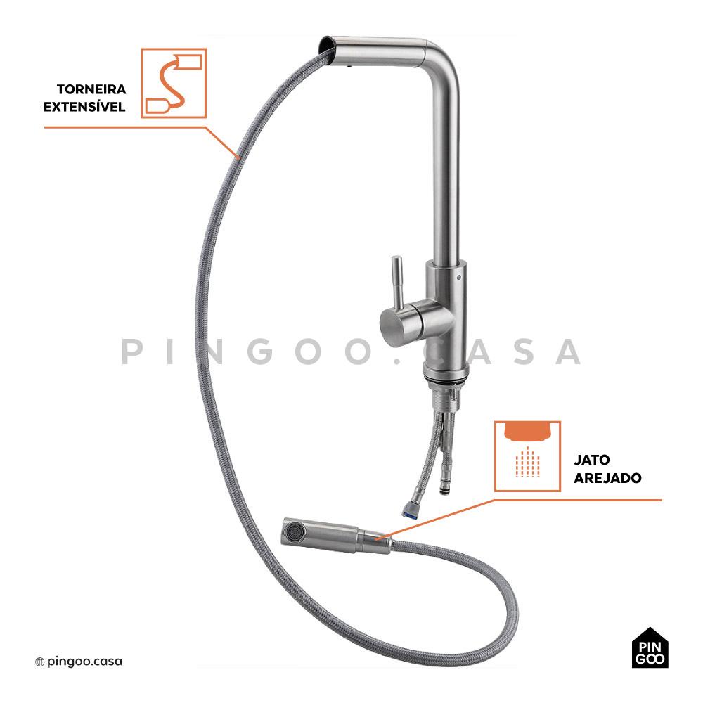 Torneira Para Cozinha Gourmet Misturador Monocomando Extensível Aço Inox 304 Gurupi Pingoo - Prata Escovado