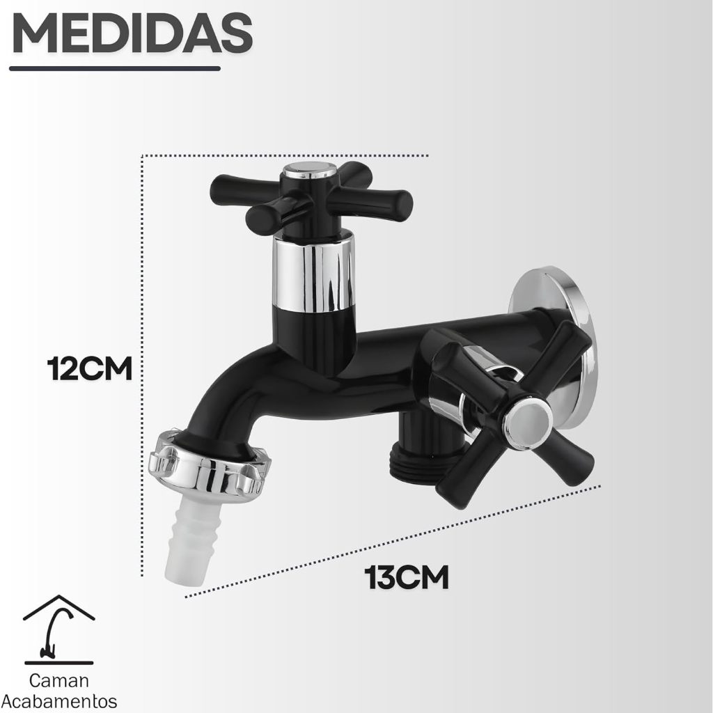 Torneira Para Tanque/Maquina 1028 Preta 1/4 De Volta 2 Saídas com Bico e Capacetes Cromados