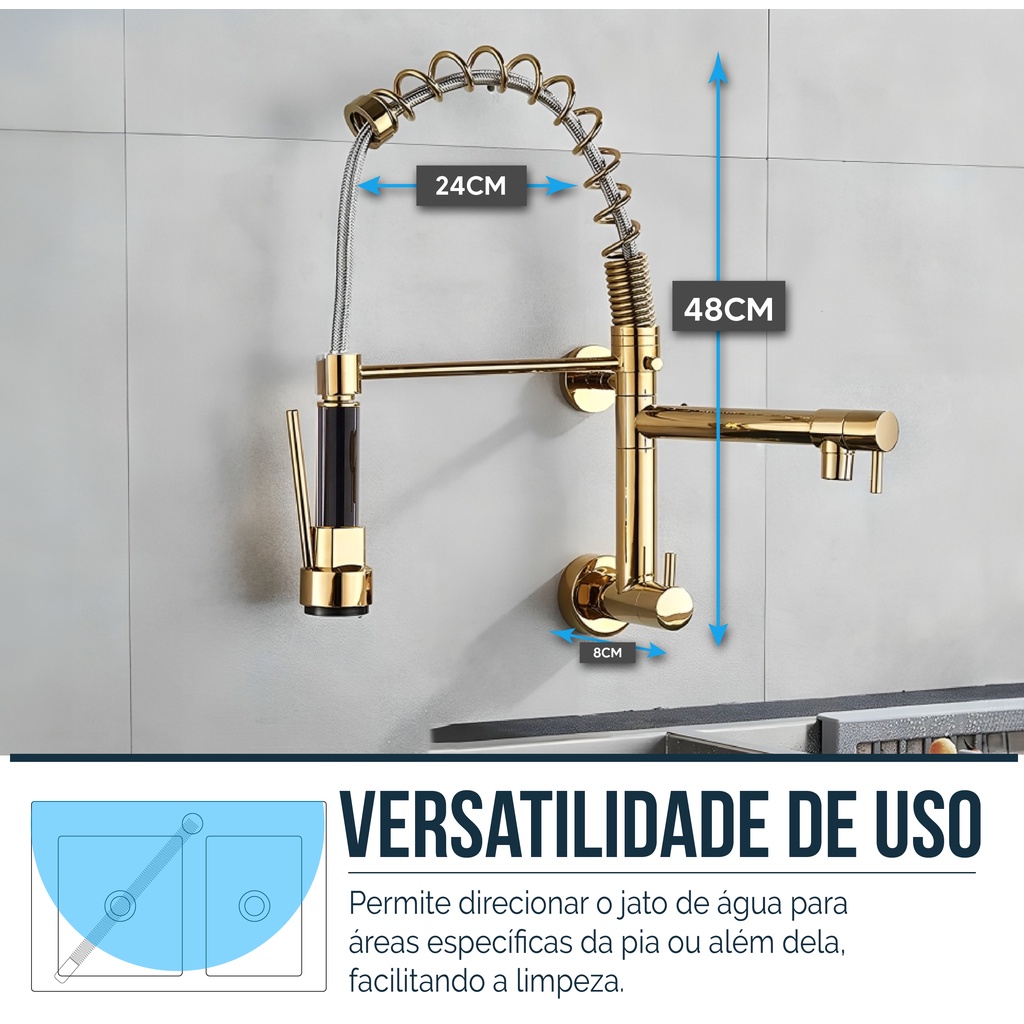 Torneira Parede Gourmet Cromada Dourado A torneira gourmet monocomando possui design moderno, estrutura flexível e acabamento sofisticado, facilitando a limpeza da pia e ajudando no controle da pressão da água para maior economia e praticidade. Informações do produto: Material predominante: Aço Material o bico direcionador: Plástico ABS Cor: Dourado Aplicação: Parede Com jato arejador Utilização: Água fria. Medidas do produto (aproximadas): Altura: 48 cm Largura: 25 cm Altura da base até a saída de água principal: 18 cm Tamanho da base: 8 cm Peso da Torneira (Kg): 1,8 Kg Medidas da embalagem (se houver): 6cm x 40cm x 40cm. Perguntas frequentes: Todos os produtos são novos e possuem garantia de 3 meses. Envio rápido, com postagem em até 24 horas úteis após o pagamento aprovado. Caso tenha mais alguma dúvida ou precise de maiores informações, utilize o campo de perguntas. Estamos à disposição para ajudar.