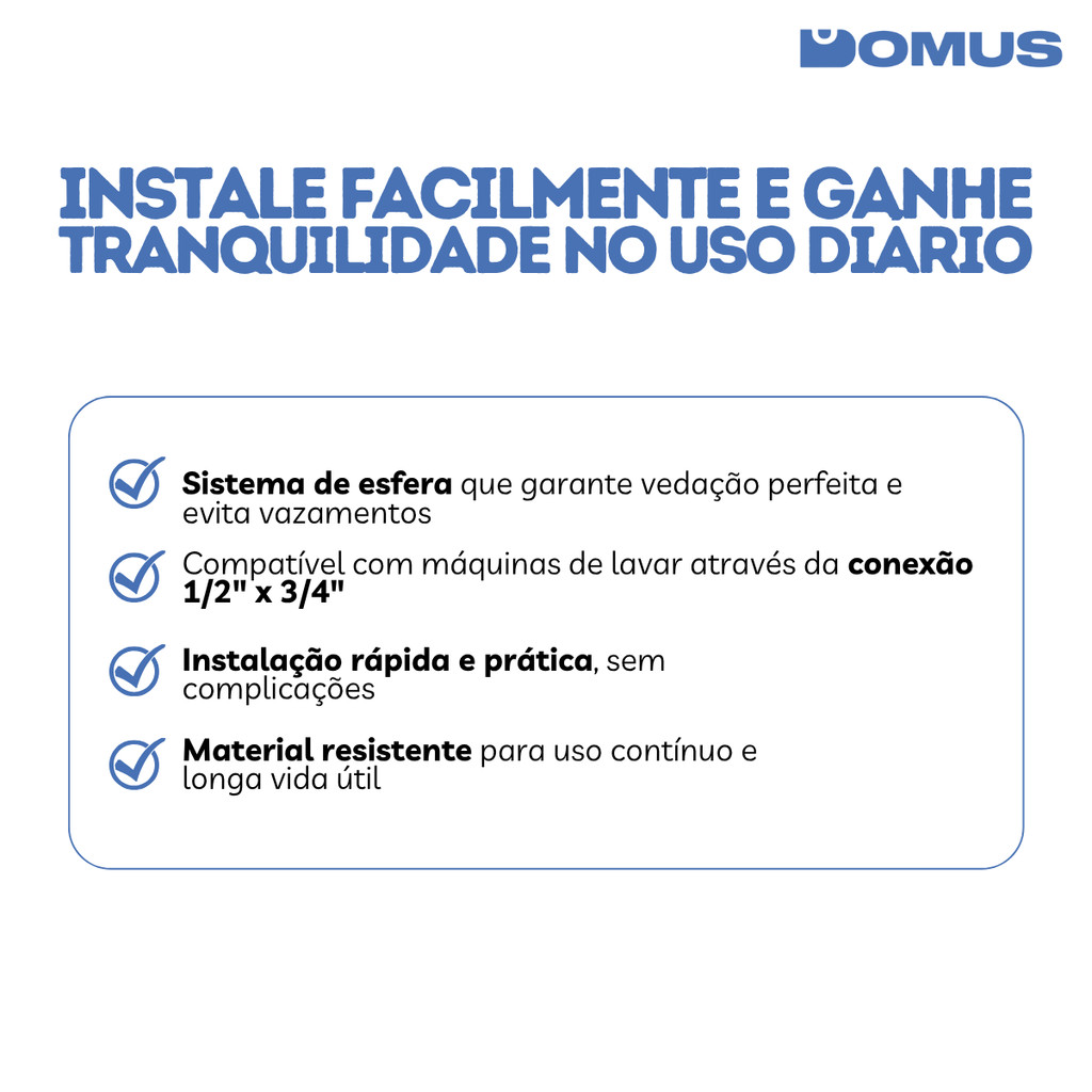 ***PRODUTO A PRONTO ENTREGA COM ENVIO IMEDIATO*** ITEM ORIGINAL COM NOTA FISCAL Somos a Domus, Loja oficial da Shopee. Temos 5 anos de experiência em E-Commerce e nosso maior objetivo é garantir a satisfação dos nossos clientes! Torneira Registro Esfera para Máquina de Lavar 1/2" x 3/4" – Higiban | Controle rápido e eficiente para conexões hidráulicas. A Torneira Registro Esfera Higiban é ideal para máquinas de lavar, oferecendo praticidade no controle da entrada de água com fechamento seguro. Seu sistema de esfera proporciona vedação eficiente e durabilidade, evitando vazamentos e garantindo mais confiança na sua instalação hidráulica. Destaques do produto: Sistema de esfera para vedação perfeita e maior durabilidade Conexão padrão 1/2" x 3/4", compatível com máquinas de lavar Instalação simples e rápida, garantindo praticidade Material resistente, assegurando longa vida útil Informações técnicas: Marca: Higiban Modelo: Registro esfera para máquina de lavar Conexões: 1/2" (entrada) x 3/4" (saída) Material: Liga metálica com acabamento cromado Cor: Cromado Conteúdo da embalagem: 1 Torneira Registro Esfera para máquina de lavar Higiban Produto original com garantia Garantia de 3 meses. Segurança, praticidade e resistência para sua instalação. Adquira já a sua!