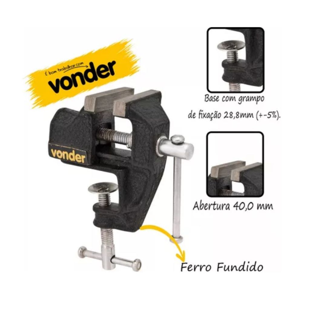 Indicado para segurar pequenas pecas e componentes em geral. Uso leve. Possui grampo de fixacao que facilita a mudanca rapida de local. Capacidade de abertura do grampo: 28,8 mm (+-5%). Conteudo da Embalagem: 1 Torno de bancada. Detalhes Tecnicos: Modelo:Mini Linha:Leve Numero do torno:2.3/4" Material:Ferro fundido Largura do mordente:70,0 mm (+/- 5 mm) Abertura maxima de utilizacao do torno:40,0 mm Tipo da base de fixacao:Base com grampo de fixacao Massa aproximada (peso):1,0 kg