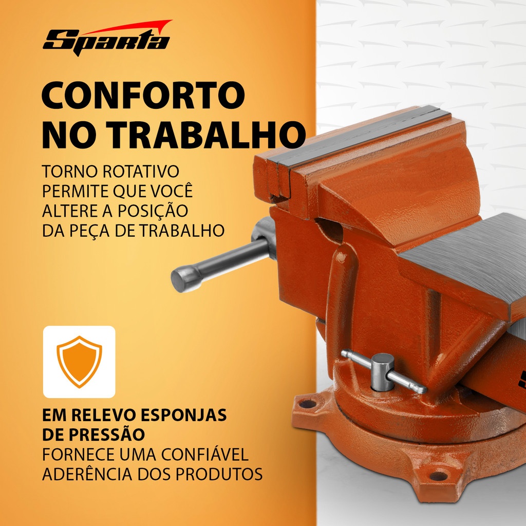 Tornos de Bancada Giratórios Sparta 1862555 com Bigorna Equipamento robusto e versátil para oficinas e garagens, ideal para trabalhos precisos com peças compactas. Com mordentes de 125 mm e capacidade para segurar peças de até 75 mm, oferece praticidade e eficiência para diversas aplicações. Principais Características: Resistência e Durabilidade • Corpo em ferro nodular fundido para estabilidade e robustez • Mordentes em aço com superfície em relevo resistentes ao desgaste • Construção projetada para longa vida útil e uso intensivo Proteção Contra Corrosão • Revestimento em pó nas superfícies não operacionais para evitar oxidação • Mantém a estética e reduz a necessidade de manutenção Flexibilidade e Conveniência • Base giratória permite fácil ajuste da posição da peça em 360° • Acesso rápido a diferentes ângulos sem necessidade de reposicionamento manual Bigorna Integrada • Ideal para trabalhos que exigem impacto, como forjamento e modelagem Segurança no Aperto • Mandíbulas com relevo que garantem fixação segura e estável das peças • Minimiza riscos de deslizamento e melhora a precisão do trabalho Estabilidade e Fixação • Pode ser fixado na bancada com parafusos, tornando-se uma ferramenta estacionária • Proporciona maior segurança e precisão em operações diversas Aplicações: • Processamento e fixação de peças compactas em mecânica, carpintaria e trabalhos gerais • Projetos DIY que exigem precisão e firmeza no manuseio de peças • Atividades que envolvem forjamento e modelagem com uso da bigorna Benefícios: • Ferramenta resistente e durável, ideal para uso profissional e amador • Aumento da produtividade com ajustes rápidos e seguros • Versatilidade para múltiplas funções em oficina ou garagem • Segurança aprimorada no manuseio das peças Medidas do Produto: • Largura das mordentes: 125 mm (12,5 cm) • Abertura máxima: aproximadamente 75 mm (7,5 cm) • Altura total: entre 130 mm e 140 mm (~13 – 14 cm) • Comprimento total: entre 250 mm e 280 mm (25 – 28 cm) • Diâmetro da base (aprox.): 125 mm • Peso: entre 5,2 kg e 6,5 kg
