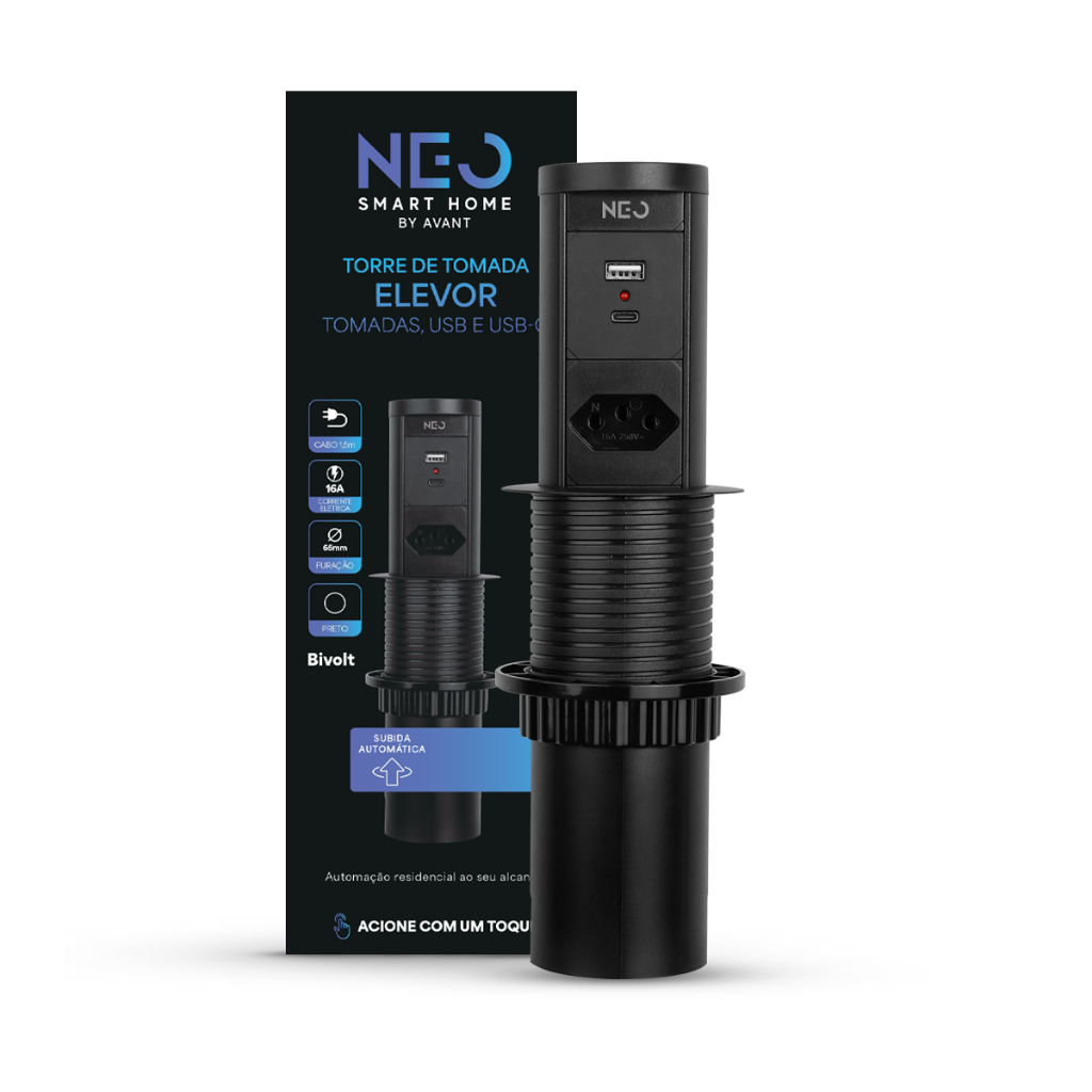 A Torre de Tomadas NEO foi projetada com cabos de 1,5m para atender às demandas de usuários exigentes e projetos elétricos especiais. Ideal para bancadas de cozinha, ilhas, e áreas gourmet, esta solução compacta proporciona acessibilidade elétrica onde você precisar. PROPRIEDADES: - 1 Tomada + 1 Entrada USB + 1 Entrada USB-C - Tomadas Flex: suportam 10A e 20a na mesma tomada, ou seja, permite ligar desde itens mais leves até itens mais robustos. - Acionamento prático somente com um toque. - Proteção IPX3: Resistente a respingos de água leves vindo de qualquer direção. - Material: Plástico e Alumínio. LOCAIS DE INSTALAÇÃO: - Mesa de escritório - Bancada de cozinha - Ilha ou península gourmet - Rack ou móvel de sala - Móvel de cabeceira - Lavanderia ou área de serviço - Mesas de reunião ou coworking CARACTERÍSTICAS TÉCNICAS: Cor: Cinza Tensão nominal: 100V – 220V (Bivolt) Furação necessária: ø 65mm Corrente Elétrica: 16A Peso: 635g Garantia Oficial de 12 meses para defeitos de fabricação. Sobre a Avant Neo: A Avant Neo é uma marca que busca oferecer soluções inovadoras e inteligentes em iluminação e automação residencial. Com produtos de alta qualidade e tecnologia de ponta, a Avant Neo traz praticidade, design e economia para o seu dia a dia.