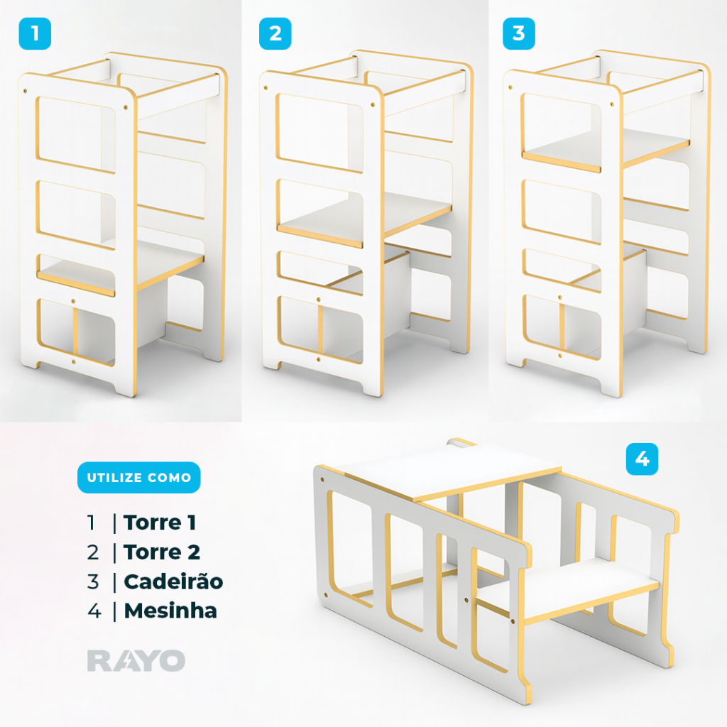 Torre de Aprendizagem Montessoriana da Rayo Descubra a Torre de Aprendizagem Montessoriana da Rayo, um produto inovador que combina funcionalidade, segurança e os princípios pedagógicos do método Montessori para promover a independência e o desenvolvimento das crianças. Características do Produto: - Material Sustentável e Seguro: Fabricada em madeira MDF de reflorestamento, esta torre de aprendizagem é uma escolha ecológica para o ambiente de brincadeira do seu filho. A pintura atóxica garante a segurança durante o uso. - Design Versátil e Prático: Este produto 4 em 1 se transforma em Torre de 2 níveis, Cadeirão, e Mesinha, adaptando-se às necessidades de cada estágio de crescimento da criança. Além disso, é fácil de montar, acompanhando um kit de montagem com chave. Benefícios Pedagógicos: - Estímulo à Autonomia: Seguindo os princípios Montessori, a torre foi desenvolvida para incentivar a independência e a aprendizagem ativa, oferecendo às crianças condições para explorar e aprender por meio da interação direta com o ambiente. - Segurança e Conforto: Projetada para ser uma experiência divertida e segura, a torre deve ser utilizada sob a supervisão de um adulto, garantindo a proteção da criança durante o uso. Especificações Técnicas: - Referência do Produto: 918 - Idade Indicada: A partir de 12 meses - Dimensões do Produto: 25x33x46 cm - Dimensões da Embalagem: 40x38x80 cm - Peso do Produto: 5,500 kg - Certificação Inmetro: Registro 008299/2021 - Capacidade Máxima: Recomendado para crianças com peso até 35kg A Torre de Aprendizagem Montessoriana da Rayo é o presente ideal para estimular o desenvolvimento da autonomia e das habilidades motoras e cognitivas das crianças a partir de 12 meses. Com sua multifuncionalidade, este produto acompanhará o crescimento do seu filho, adaptando-se às suas necessidades e promovendo um aprendizado ativo e independente. Adquira já e ofereça ao seu pequeno um ambiente de aprendizagem seguro e estimulante!