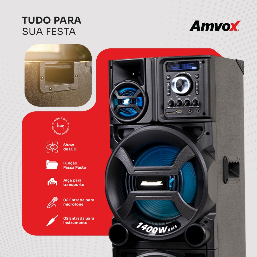 Torre de Som 1400W Amvox ACA 1402 Titan Black Duplo Woofer 10 Led TWS Bivolt bluetooth sem FM