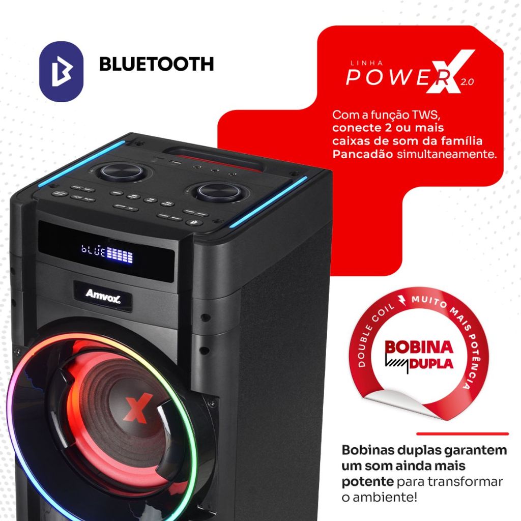 Torre de Som Amvox ATX 2200M Pancadão 2200W RMS Bluetooth Bivolt Woffer de 10"