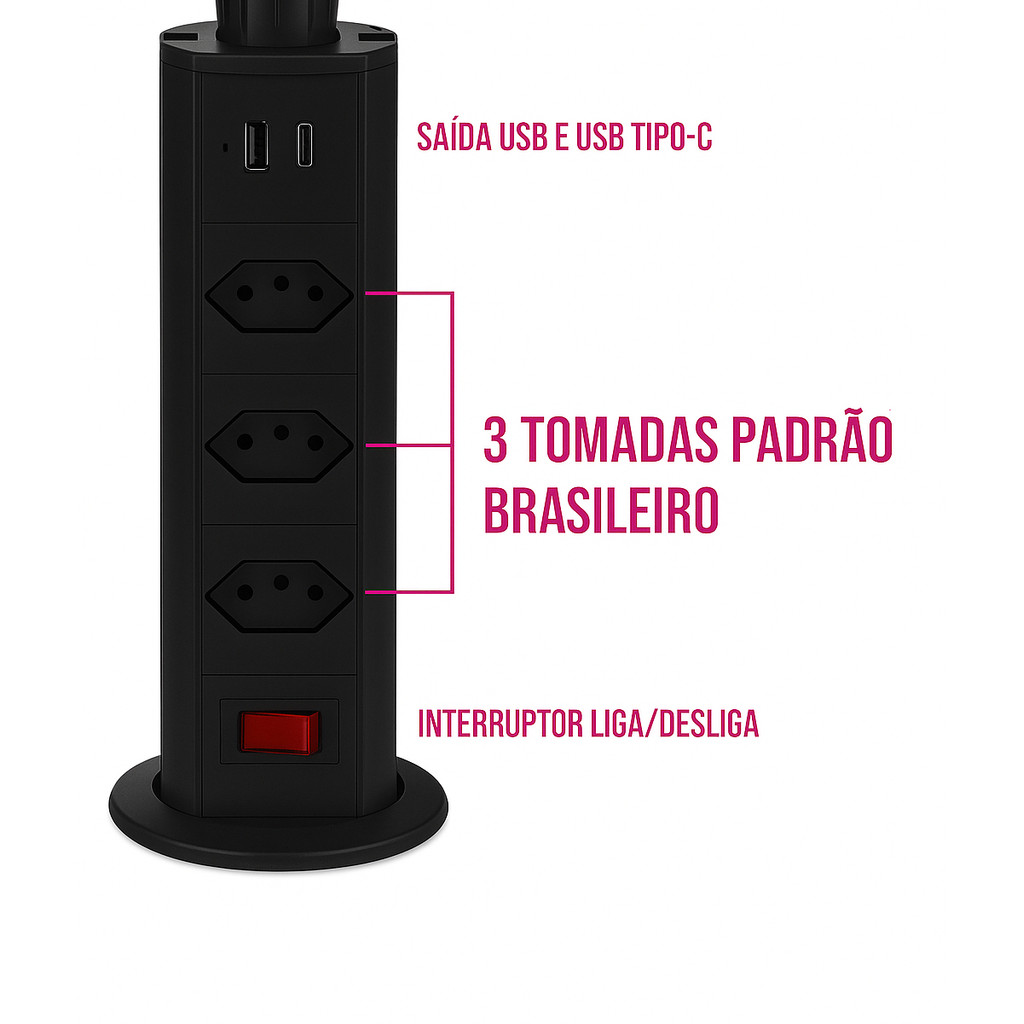 Torre de Tomada Mesa Extensão USB e Tipo C Retrátil Proteção Sobrecarga Escritório Bancada