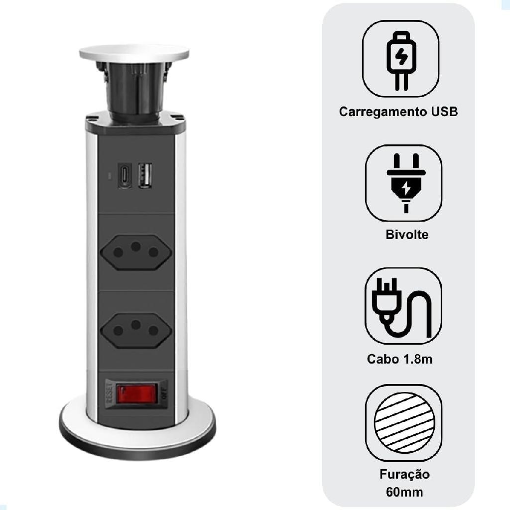 ⚡ Torre de Tomadas Multiplug Retrátil | 2 Tomadas + USB + USB-C | Embutir em Móveis e Bancadas ✨ Organização, Praticidade e Conectividade Escondida para Seu Ambiente! Cansado de fios e tomadas espalhadas? A Torre de Tomadas Multiplug Retrátil é a solução perfeita para um ambiente mais organizado e funcional! Com um design moderno e discreto, ela fica elegantemente embutida dentro do seu móvel, revelando-se com um simples clique para oferecer todas as conexões que você precisa. Perfeita para cozinhas, escritórios, bancadas e mesas de trabalho! 🏡💻 Por Que a Nossa Torre Multiplug É a Escolha Ideal para Você? ✅ Design Retrátil e Discreto: Esconda suas tomadas quando não estiver usando! Com o sistema "Push to Open" (empurre para abrir), a torre surge com um toque e se retrai facilmente, mantendo seu espaço limpo e elegante. 🚀 ✅ Conectividade Completa: Equipada com 2 tomadas de 3 pinos (padrão brasileiro), 1 entrada USB e 1 entrada USB-C. Carregue smartphones, tablets, notebooks e conecte seus eletrônicos com total versatilidade! 🔌📱 ✅ Proteção Avançada: * Resistente a Respingos de Água: Pode ser instalada em ambientes como a pia da cozinha sem preocupações. 💧 * Proteção Anti-Choque para Crianças: Mais segurança para sua família. 👶 * Proteção contra Quedas e Oscilações de Energia: Garanta a segurança dos seus aparelhos. ⚡ ✅ Qualidade Premium: Fabricada com material de excelente qualidade e um acabamento premium, garantindo durabilidade e um visual sofisticado. ✨ ✅ Espaçamento Inteligente: O bom espaçamento entre as tomadas permite conectar carregadores e adaptadores maiores sem bloquear as outras entradas. 📏 🛠️ Dicas para uma Instalação Perfeita: Verifique o Espaço: Certifique-se de que há espaço suficiente (aberta e fechada) para a torre se acomodar no local. Folga para o Cabo: Deixe uma folga no cabo para garantir o movimento suave de subida e descida. Furo Ideal: Com uma serra copo, faça um furo circular de 60mm de diâmetro. A torre pode ser instalada em superfícies com até 50mm de espessura. Travamento Seguro: Antes de instalar, separe o anel de travamento. Insira a torre no furo até o anel cromado ficar rente à superfície. Gire a torre para a posição desejada. Finalize o Encaixe: Posicione o anel de travamento na rosca e gire no sentido horário até comprimi-lo contra a superfície. Certifique-se de que o encaixe está perfeito e a torre firmemente instalada. 📦 Itens Inclusos na Embalagem: 01 Torre de Tomada de Embutir Retrátil (com 2 Tomadas, 1 USB e 1 USB-C) Transforme seu ambiente com funcionalidade, segurança e um toque de modernidade! Garanta já sua Torre de Tomadas Retrátil! 🛒