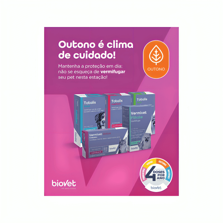 ✅ Indicação & Benefícios Ideal para cães de porte pequeno (até ~10 kg): cachorrinhos e filhotes 🐶 Elimina vermes redondos e chatos — garante saúde intestinal e prevenção de verminoses comuns. Fórmula completa e eficaz, com múltiplos compostos — ação ampla e segura. Comprimido palatável e sulcado: facilita a administração, deixando o momento tranquilo para você e agradável para o pet. 📦 Como usar / Posologia Administre por via oral — direto na boca ou misturado à ração. Dosagem recomendada para o Totalis Mini (comprimido de 330 mg): Até 2,5 kg → ½ comprimido 2,5 kg a 5 kg → 1 comprimido 5 kg a 7,5 kg → 1½ comprimidos 7,5 kg a 10 kg → 2 comprimidos Tratamento em dose única, com reforço após ~15 dias, conforme orientação veterinária. ❓ Perguntas Frequentes (FAQ) Serve para filhotes e cães pequenos? Sim! O Totalis Mini é indicado para cães de porte pequeno e costuma ser seguro também para filhotes, desde que usado conforme bula. Precisa jejum antes da dose? Não — você pode administrar diretamente ou junto à ração sem alterar a rotina do pet. Com que frequência devo dar? Dose única + reforço após 15 dias. A periodicidade depois depende da orientação do veterinário. Quais problemas previne? Previne vermes intestinais comuns, ajudando a evitar sintomas como diarreia, perda de peso, mal-estar e desconforto digestivo. ❤️ Cuide do seu melhor amigo com carinho e responsabilidade Seu cãozinho pequeno merece correr, brincar e crescer saudável — longe dos vermes e desconfortos intestinais. Com Totalis Mini, você garante proteção completa e bem-estar para seu pet. Não espere, ofereça a ele o cuidado que ele merece! 🐾💙
