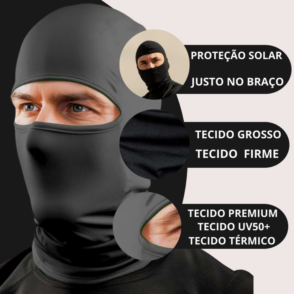 Kit de 2 Touca Ninja Balaclava Toca UV+50 Proteção Solar Térmica Motoqueiro Motoboy touca preta Touca Ninja com proteção UV50; Costura reforçada Tecido composto de ALGODAO+elastano, oferecendo grande elasticidade e adaptabilidade a qualquer tipo de cabeça; A balaclava é excelente para dias frios, para proteção do vento gelado; Leve, resistente e respirável. Na linha esportiva temos alguns produtos com a proteção UV 50+, mas você sabe o que significa essa proteção? Significa que o produto tem uma proteção que bloqueia a passagem de raios solares ultravioletas (UVA e UVB), protege a pele com fator acima de FPS 50+. Esse tipo de proteção é fruto de uma combinação da estrutura do tecido com acabamentos químicos, e o poliéster, devido a sua característica química é a que oferece o maior índice de proteção. Touca Ninja Balaclava Sol e Frio Intenso Vento Gênero: Unissex Indicado para: Dia a Dia