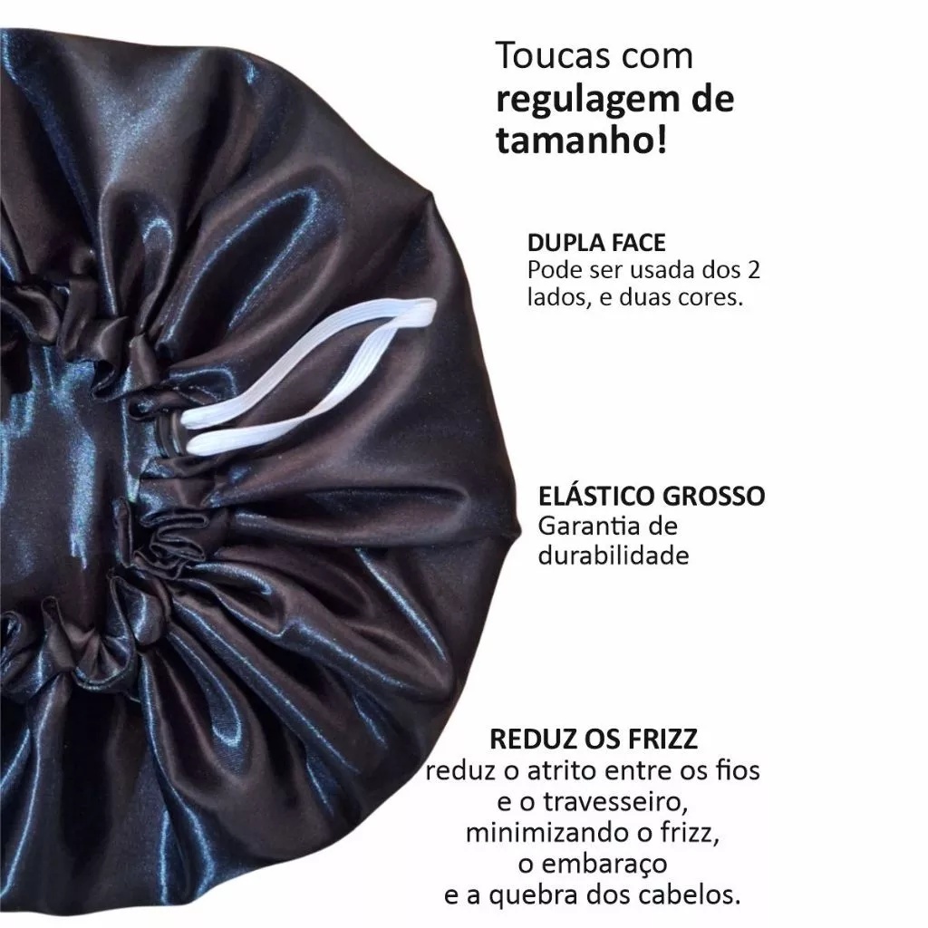 Touca de Cetim Dupla Face – Proteção, Estilo e Fios Sempre Saudáveis! ✨ A touca de cetim é a solução ideal para quem quer acordar com os cabelos mais bonitos, alinhados e sem frizz. Diferente do algodão, o cetim reduz o atrito com o travesseiro, mantendo a hidratação natural dos fios e evitando quebra, ressecamento e embaraços. Com design dupla face, regulagem confortável e material leve, ela é perfeita para preservar cachos, penteados e até cabelos lisos, garantindo resultados visíveis já na primeira noite de uso. ✅ Benefícios principais: Reduz o frizz e previne a quebra dos fios. Mantém a hidratação natural por mais tempo. Ajuda a conservar cachos, lisos e penteados durante o sono. Design dupla face: duas cores em uma só touca. Ajustável e confortável para usar a noite toda. Indicada para todos os tipos de cabelo (ondulados, cacheados, crespos e lisos). 📦 Informações do produto: Kit: Touca de cetim + 1 xuxinha de brinde. Material: Cetim de alta qualidade (dupla camada). Tamanho: único, ajustável. Cores enviadas de forma aleatória (conforme disponibilidade). 💡 Dica: use sua touca todas as noites para manter os fios mais hidratados, reduzir o frizz e acordar com o cabelo sempre saudável e bonito.