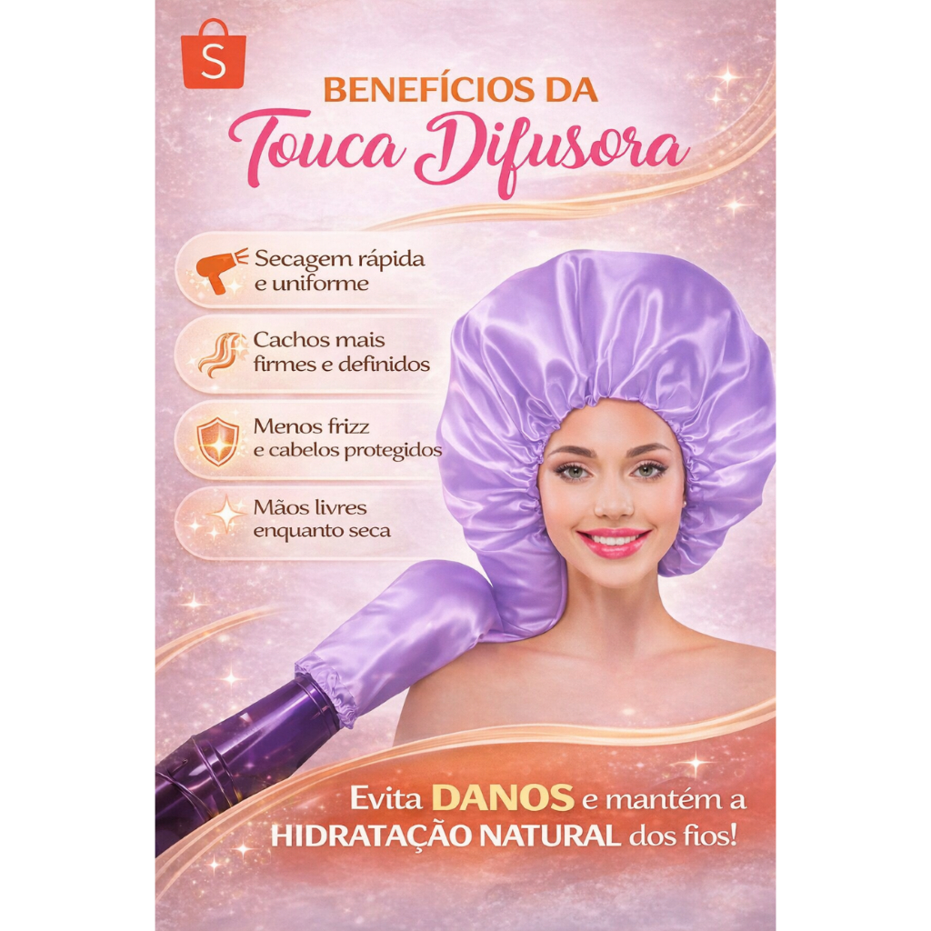 ✨ TOUCA DIFUSORA DE CETIM PARA SECADOR Praticidade, definição e cuidado com os fios no seu dia a dia! A Touca Difusora de Cetim foi desenvolvida para proporcionar uma secagem mais rápida, prática e uniforme, ajudando a manter a definição dos cachos e reduzindo o frizz. Ideal para quem deseja secar o cabelo com conforto enquanto realiza outras atividades. Além de auxiliar na secagem, a touca também pode ser utilizada para potencializar tratamentos capilares, ajudando na absorção de máscaras de hidratação, nutrição ou reconstrução. O tecido em cetim suave ajuda a diminuir o atrito entre os fios, contribuindo para cabelos mais alinhados, macios e com menos frizz. 💖 BENEFÍCIOS DO PRODUTO ✔ Secagem mais rápida e uniforme ✔ Ajuda a reduzir o frizz ✔ Mantém a definição dos cachos ✔ Permite secar o cabelo com as mãos livres ✔ Ideal para potencializar tratamentos capilares ✔ Tecido em cetim suave que ajuda a proteger os fios 🧵 DESIGN CONFORTÁVEL E AJUSTÁVEL O produto possui ajuste elástico na circunferência da cabeça, proporcionando maior conforto e adaptação a diferentes tamanhos. Também conta com ajuste no braço que conecta ao secador, permitindo um encaixe firme e compatível com diversos modelos de secadores de cabelo. Seu design foi pensado para oferecer praticidade, segurança e conforto durante o uso. 📦 ESPECIFICAÇÕES • Material: Cetim • Ajuste elástico na cabeça • Encaixe ajustável para secador • Leve, prático e fácil de usar 💡 INDICADO PARA • Cabelos cacheados • Cabelos ondulados • Finalização de penteados • Potencializar hidratações capilares ✨ Praticidade, cuidado e definição para seus cabelos no dia a dia!