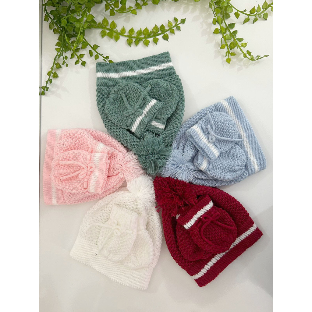 Touca e Luva em tricô para bebê 0 a 3 meses com listra