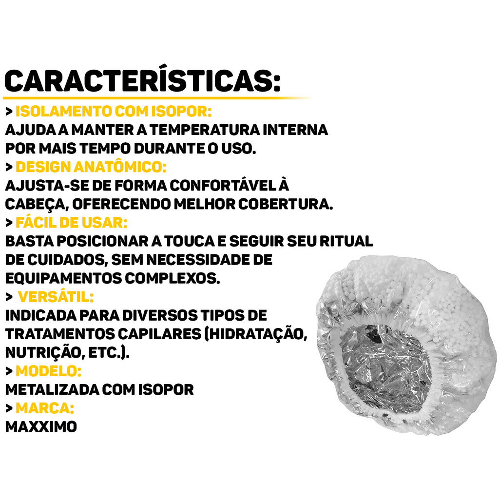Touca Térmica Metalizada com Isopor Máxximo A Touca Térmica Máxximo foi desenvolvida para potencializar seus tratamentos capilares. Ideal para hidratações, nutrições e reconstruções, ela retém o calor natural do couro cabeludo, abrindo as cutículas dos fios e permitindo uma melhor absorção dos ativos dos cremes e máscaras. Desenvolvida com camada interna de isopor e revestimento metalizado, a touca garante aquecimento uniforme. Leve e confortável, é perfeita para quem busca resultados de salão no conforto de casa. Características: > Reutilizável, leve e prática; > Tamanho único com elástico ajustável; > Aumenta a absorção dos nutrientes nos fios; > Potencializa hidratações e tratamentos capilares; > Produzida em 100% polipropileno, 100% polietileno externo, enchimento com isopor e acabamento metalizado. - Marca: Máxximo - Garantia: 90 dias contra defeitos de fabricação Vantagens de comprar na Brester: - Produto a pronta entrega. - Produto novo, com garantia de fábrica. - Nota fiscal para Pessoa Física e Pessoa Jurídica.